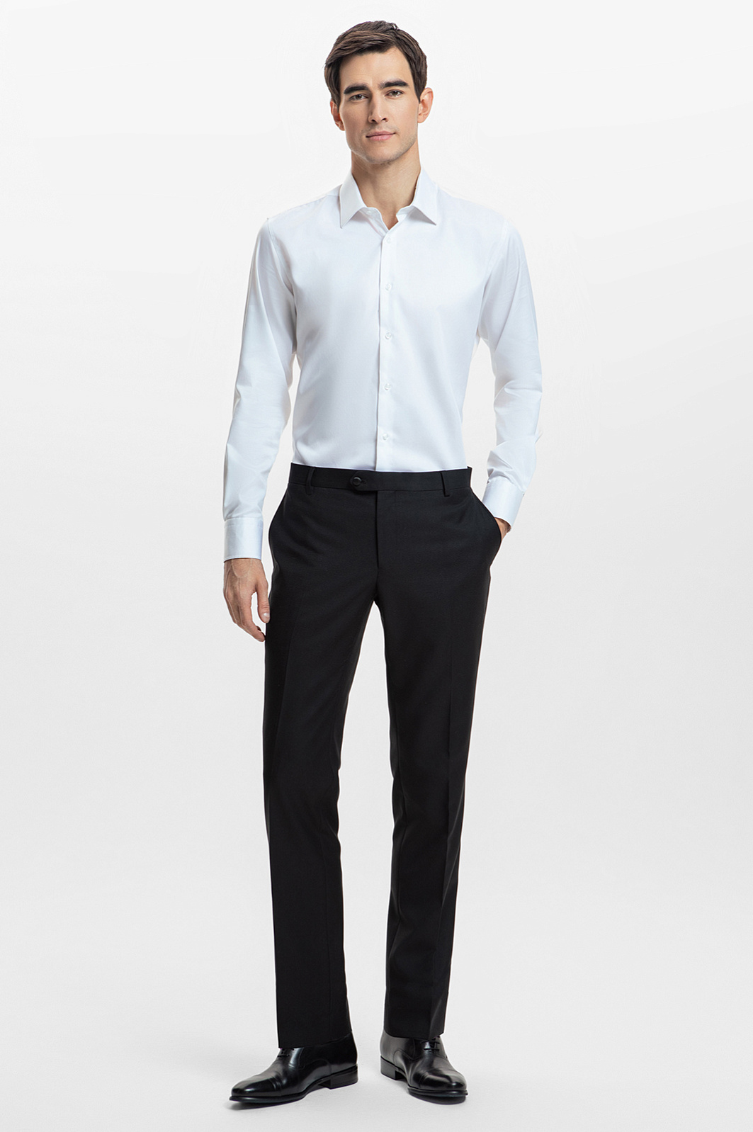 Классические черные брюки под смокинг со стрелками – ключевой элемент образа для особых случаев, будь то корпоративный вечер, торжественный прием, премьера в театре или свадьба. Дизайнеры KANZLER позаботились о том, чтобы в брюках было комфортно даже во время длительных мероприятий. Мягкий и прочный смесовый материал приятно ощущается на коже и сохраняет первоначальную форму в течение долгого времени. Подкладка из полиэстера и хлопка обеспечивает комфорт во время длительного ношения и поддерживает оптимальный воздухообмен. Приталенный крой подчеркивает достоинства фигуры, а классические стрелки визуально вытягивают силуэт. Предлагаем сочетать модель с пиджаком-смокингом из того же материала, белой рубашкой, галстуком-бабочкой и классическими кожаными туфлями. Параметры модели: рост 192, 101-76-97 Размер на модели: 50