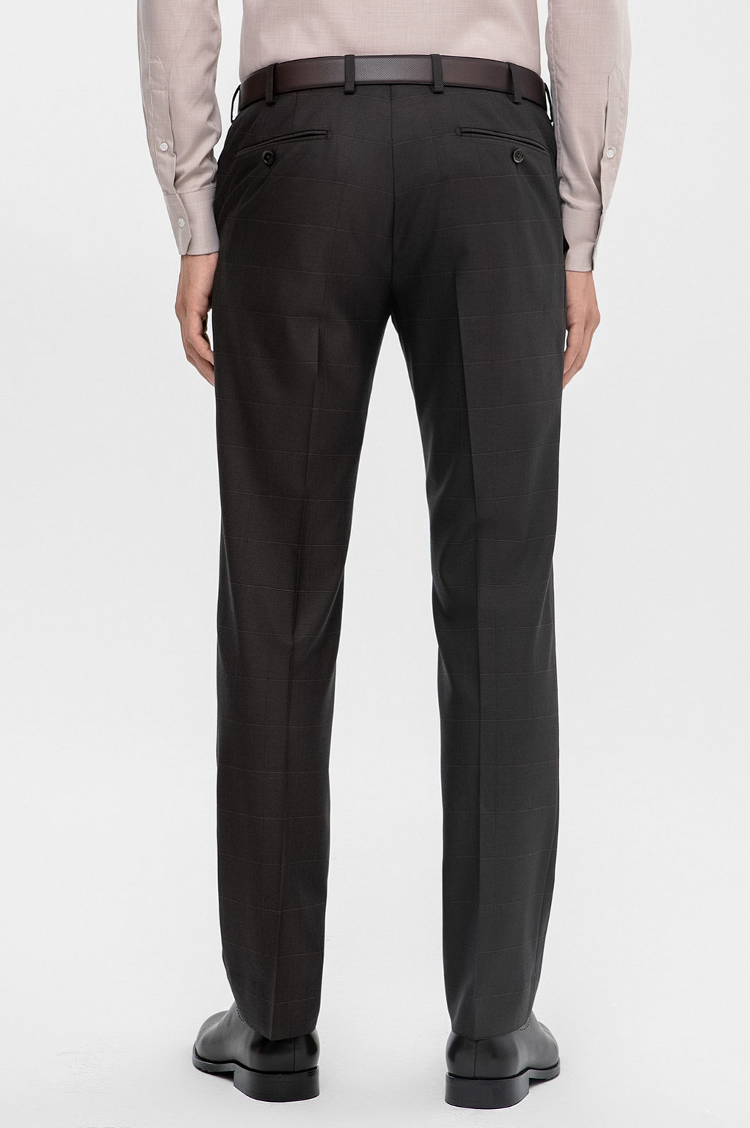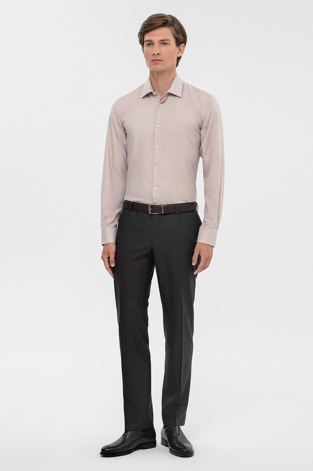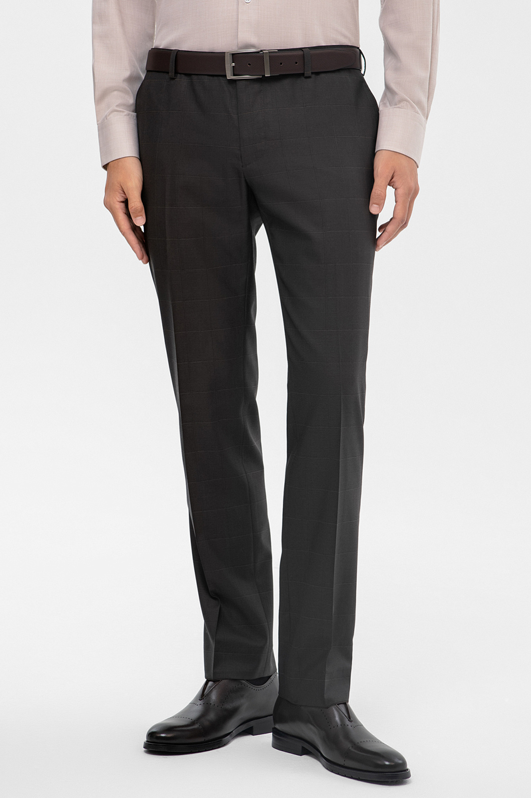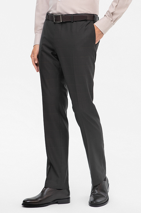 Приталенные классические брюки KANZLER в графитовом оттенке - незаменимая база в гардеробе делового мужчины. Изготовленные из 100% шерсти, они обладают изысканным, благородным блеском, что придаёт им элегантность. Тонкая премиальная шерсть Супер 140 обеспечивает комфорт в носке и отлично держит форму. Едва заметный рисунок в клетку добавляет изделию глубины и визуальных акцентов, сохраняя при этом классическую офисную строгость. Приталенный Приталенный силуэт подчёркивает фигуру и создает аккуратный, современный образ - идеально для деловых встреч и повседневного офисного стиля. Наши стилисты советуют дополнить образ пиджаком в тон, бежевой рубашкой и лоферами. Параметры модели: рост 191, 97-77-99 Размер на модели: 50