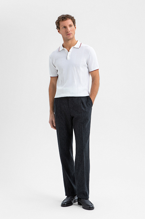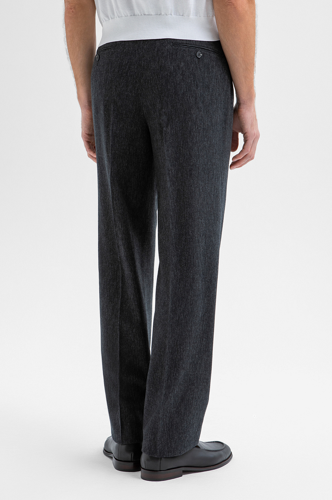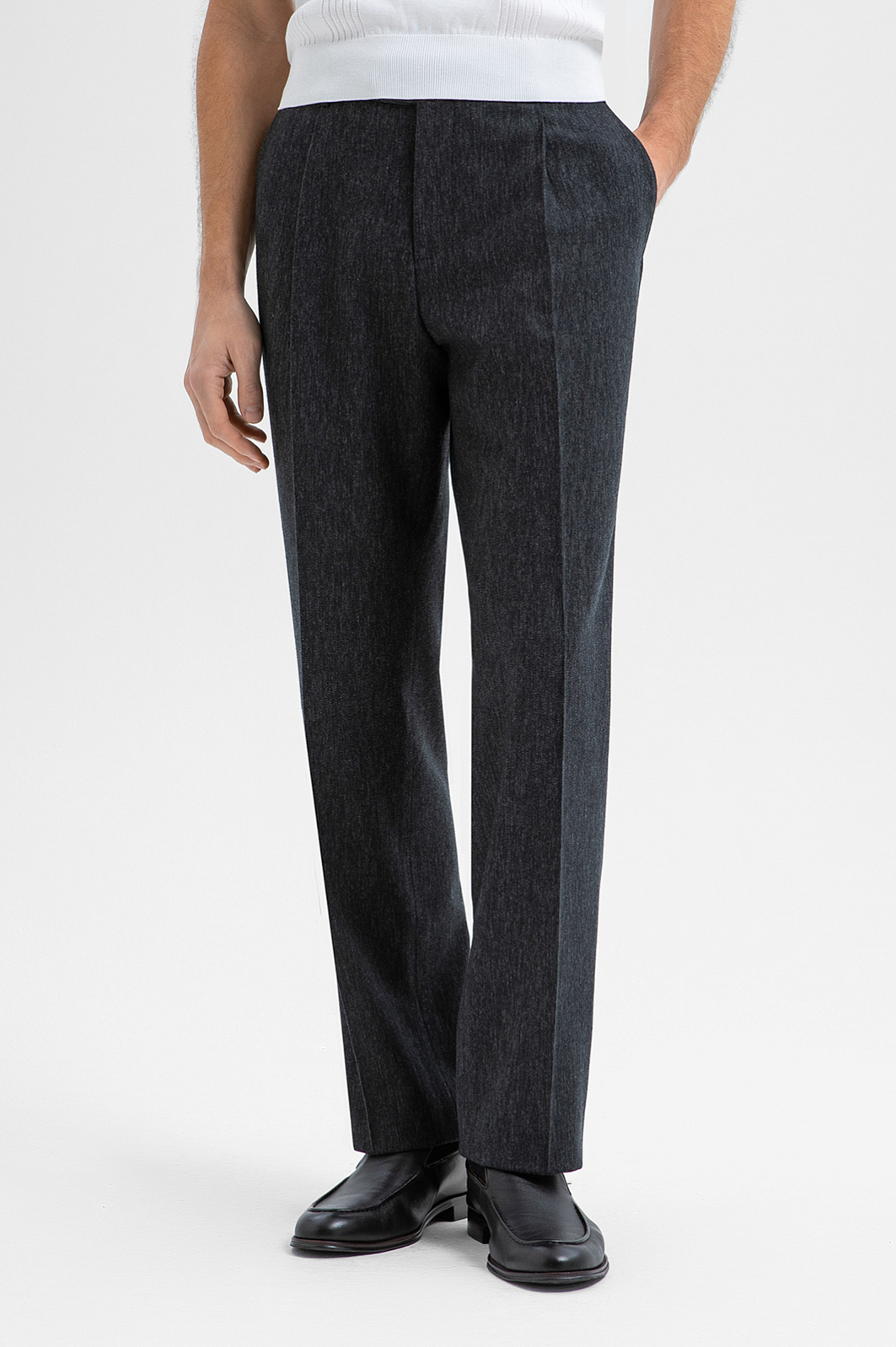 Роскошные тёмно-серые брюки KANZLER с лёгким меланжевым эффектом из драгоценной шерсти мериноса — воплощение классической элегантности с ноткой ретро-шика. Прямой, умеренно свободный крой и мягкие защипы на поясе формируют расслабленный, но лаконичный силуэт. Стрелки визуально вытягивают фигуру и придают образу нарядность. Мериносовая шерсть отличается исключительной мягкостью и способностью адаптироваться к любой погоде, сохраняя комфортную для тела температуру. Нежные гипоаллергенные волокна не раздражают даже очень чувствительную кожу и придают ткани благородную фактуру и деликатный матовый эффект.