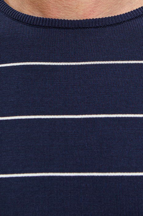 Вдохновленные океанами, морскими пейзажами и таяниями ледников, дизайнеры KANZLER представили джемпер в благородном насыщенном синем оттенке в тонкую горизонтальную полоску. Он словно создан для комфортного расслабленного образа в стиле кежуал. Тонкий, но прочный дышащий материал из натурального хлопка хорошо пропускает влагу, не вызывает аллергии и очень приятен к телу. Дополнительный комфорт придают детали — трикотажные манжеты и резинка внизу. Крой не сковывает движения, и Вы будете чувствовать себя комфортно как на прогулке по набережной вдоль моря, так и в офисе. Сине-белая морская гамма гармонично сочетается со светлым низом — белыми или бежевыми брюками и светло-голубыми джинсами. Параметры модели: рост 190, 108-86-96 Размер на модели: M