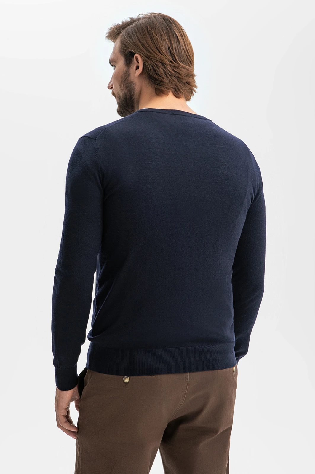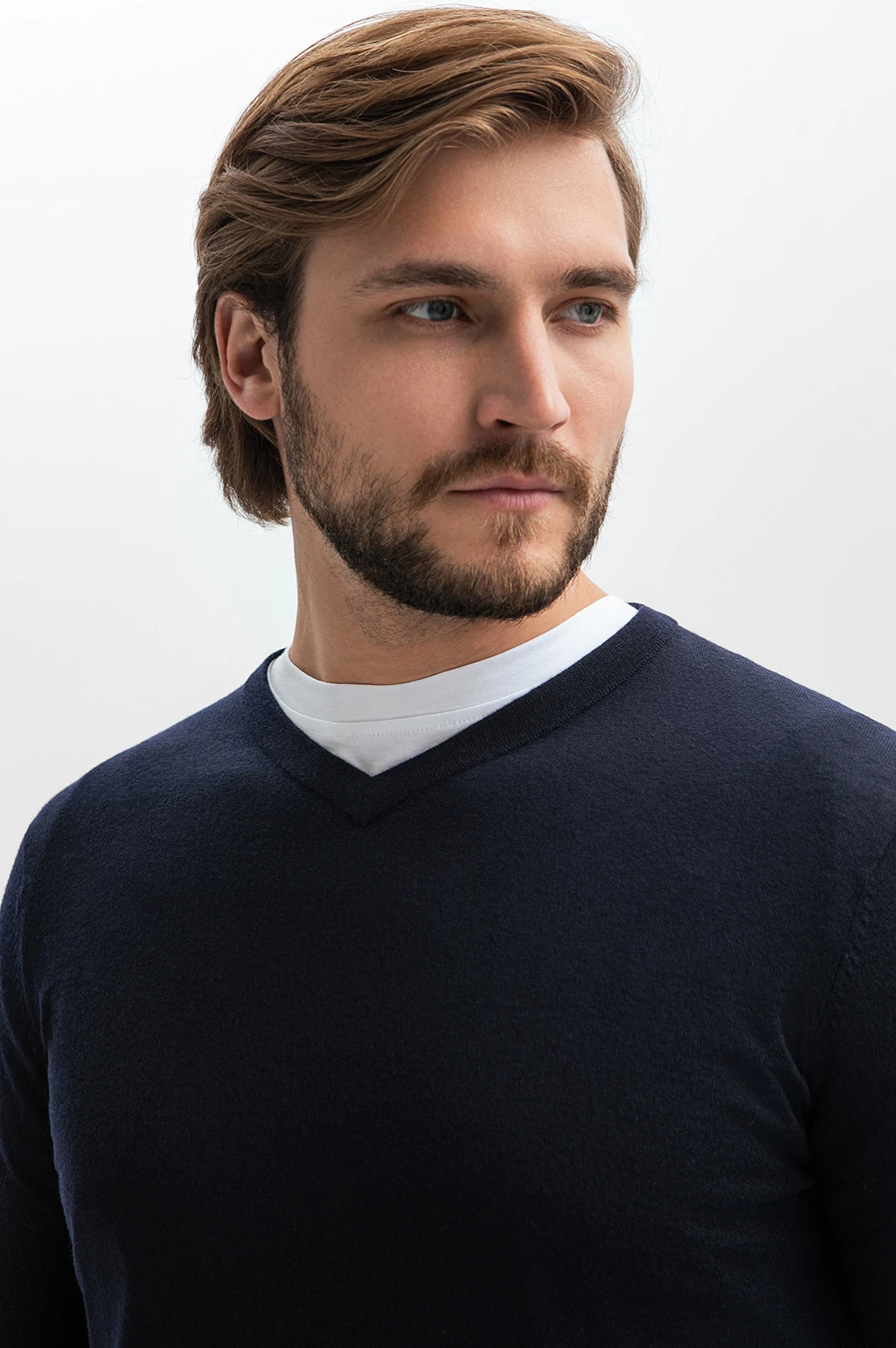 Пуловер KANZLER связали из тонкой шерстяной пряжи с добавлением нежного кашемира для особенной мягкости и тепла. Шерсть обладает отличными теплоизоляционными свойствами, регулирует температуру тела и обеспечивает хорошую воздухопроницаемость. Кашемир добавляет изделию особую мягкость и роскошную текстуру. Гипоаллергенный материал получился чрезвычайно лёгким - благодаря чему пуловер можно носить на голое тело, ощущая максимальный комфорт. треугольный вырез вытягивает силуэт, делая образ более элегантным и стройным, а универсальный Синий оттенок позволяет легко сочетать эту модель с различными предметами гардероба, обеспечивая безупречный стиль в любых ситуациях. В качестве декора дизайнеры использовали небольшой металлический патч с логотипом бренда, который добавляет акцента и подчеркивает внимание к деталям. Джемпер KANZLER отлично подходит для создания многослойных комплектов. Параметры модели: рост 187, 100-81-97 Размер на модели: M