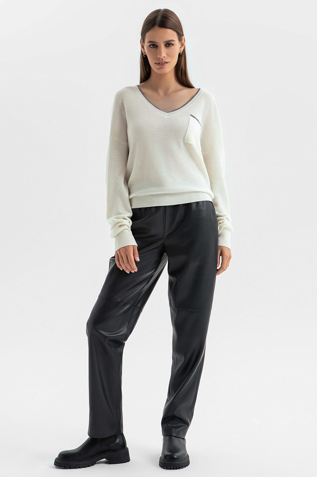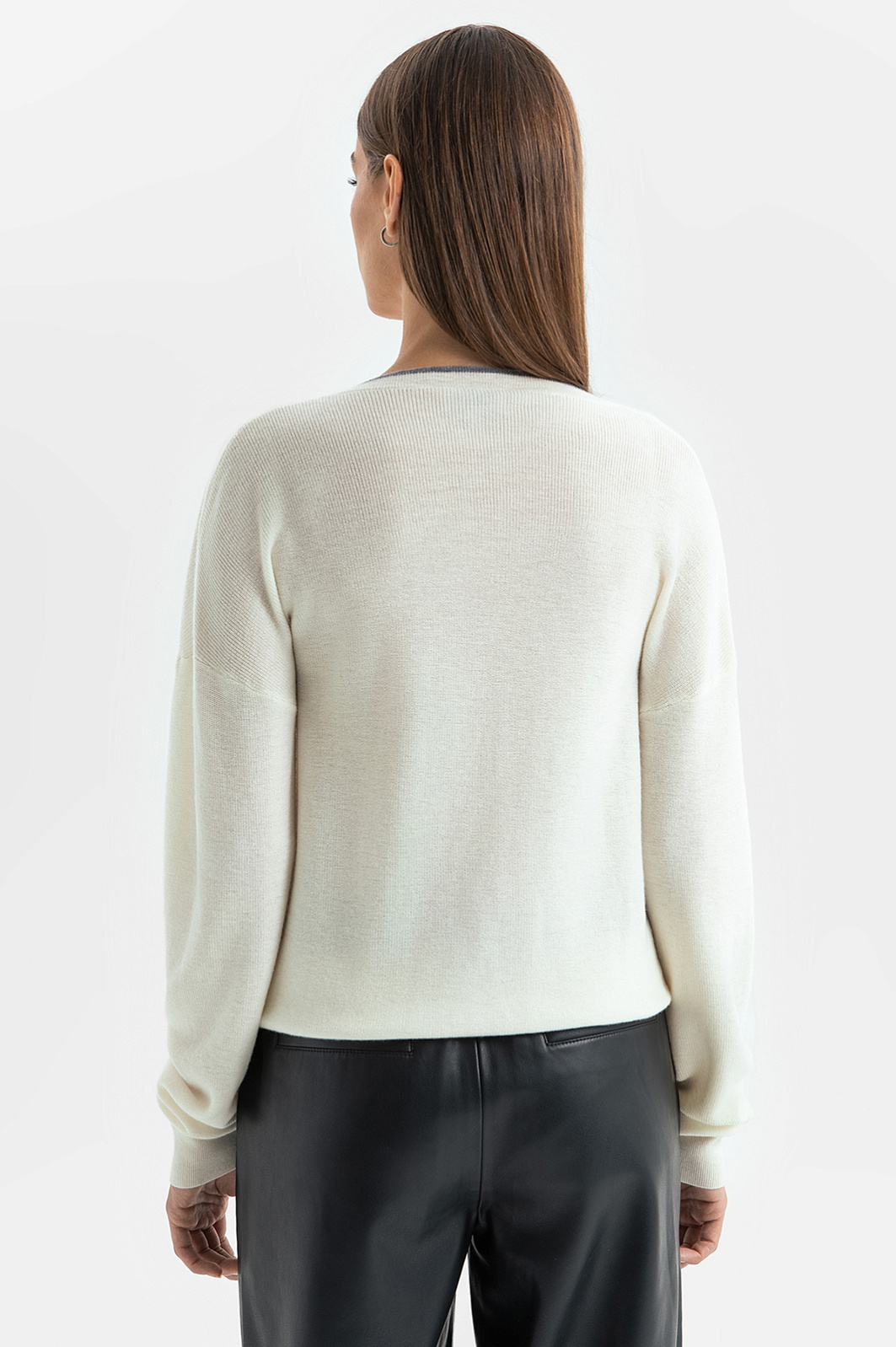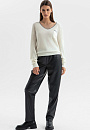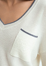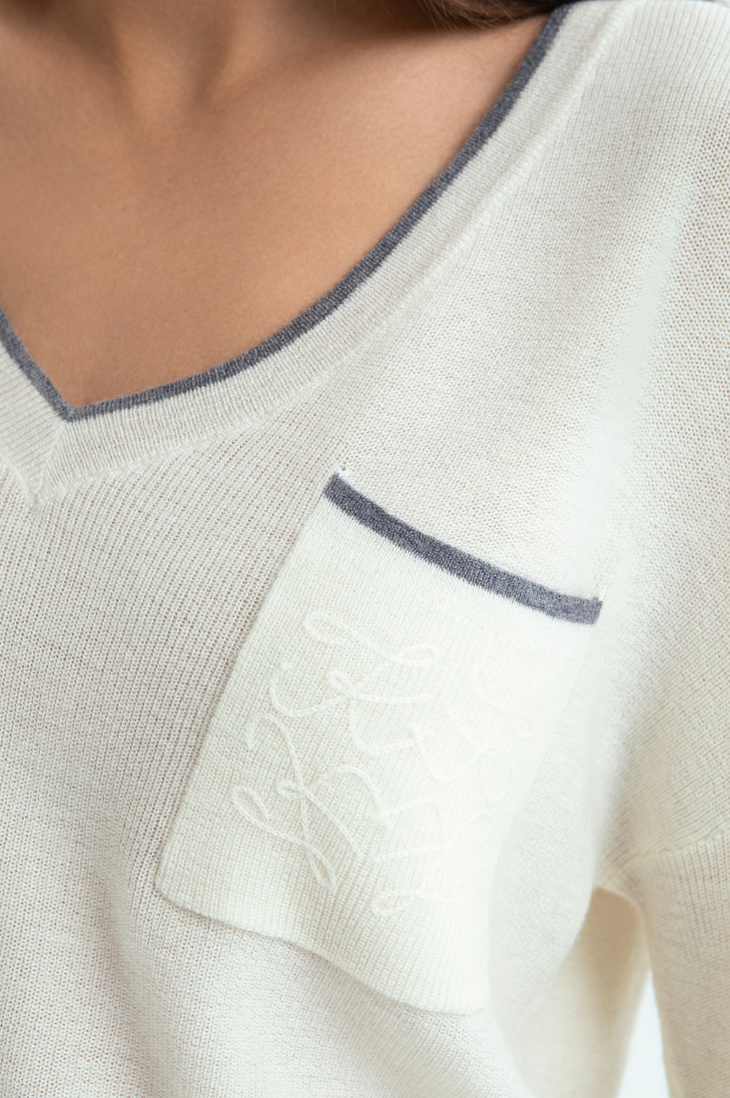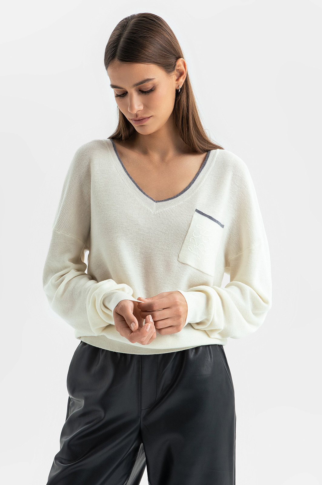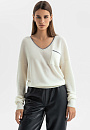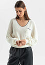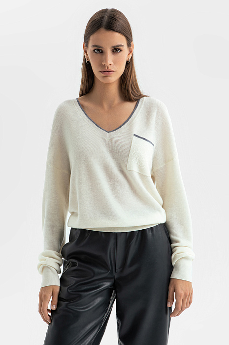 Белый джемпер KANZLER с широким треугольным вырезом из шерсти с кашемиром в стиле "тихая роскошь" идеально подходит для перелета в самолете, расслабленного отдыха, уикенда вдвоем и завтрака в красивом уютном месте. Лаконичный дизайн сочетается с оригинальными деталями — удлиненными рукавами, которые собираются на запястьях в красивые мягкие складки, изысканной вышивкой и тонкой серой полоской, подчеркивающей вырез и край кармана. Широкие трикотажные резинки обеспечивают аккуратную посадку. Мягкий дорогой смесовый трикотаж — союз теплоты и нежности. Шерсть поддерживает оптимальную для тела температуру, а легкий кашемир создает приятные тактильные ощущения.