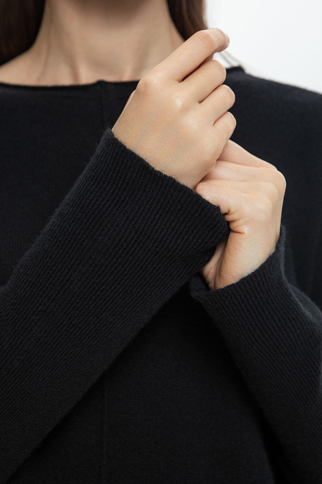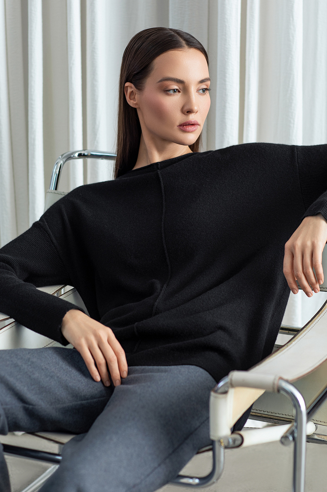 Изысканный женский черный джемпер, созданный из премиального смесового материала (70% шерсти и 30% кашемира), станет абсолютной необходимостью в гардеробе. Его элегантный и минималистичный дизайн подходит для любых случаев: от офисного стиля до расслабленного вечера с друзьями. Мягкая текстура материала и свободный крой дарят ощущение комфорта, а терморегулирующие свойства шерсти и кашемира обеспечивают тепло в холодные дни. Джемпер отлично комбинируется с классическими брюками, юбками и даже джинсами, что делает его универсальным решением для разных ситуаций. Параметры модели: рост 177, 85-61-92 Размер на модели: S