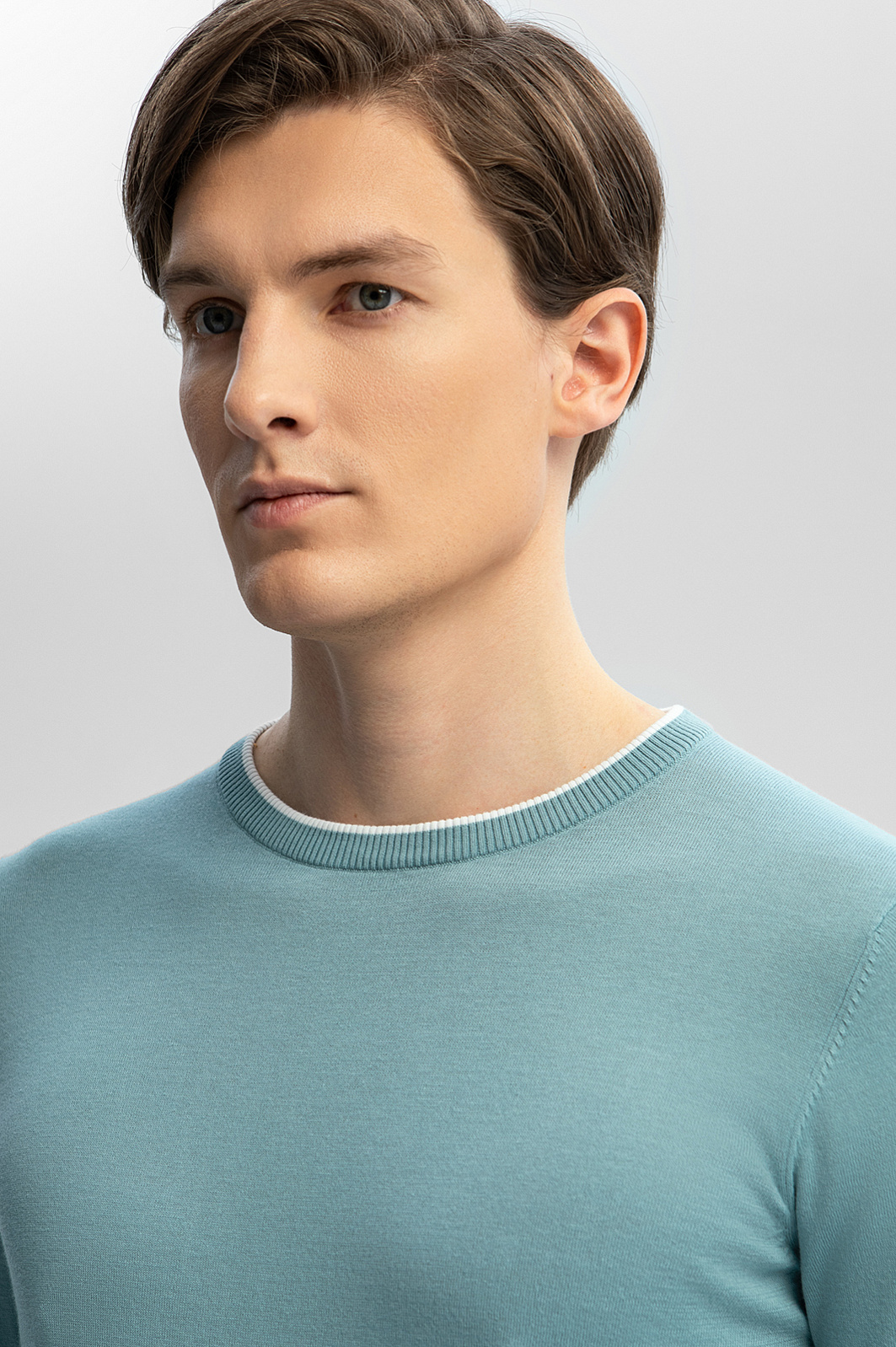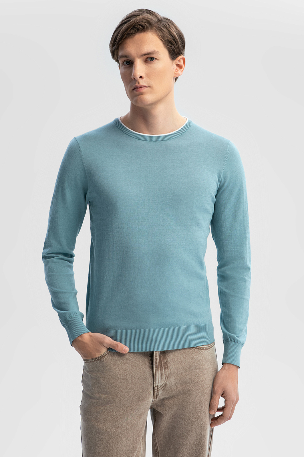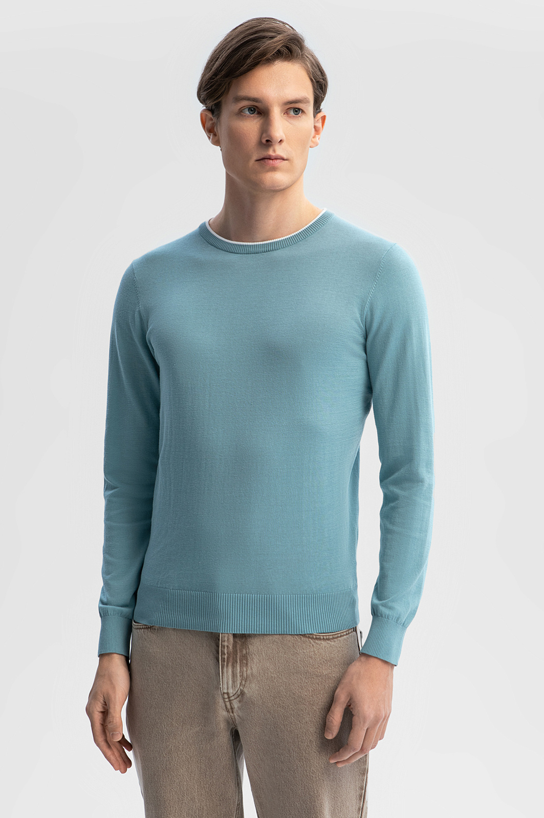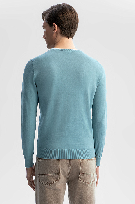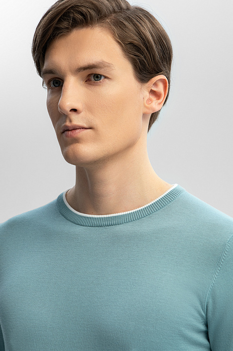 Джемпер KANZLER в мятном оттенке – универсальный выбор для рабочего дня в офисе, прогулок, встреч и неформальных мероприятий. Натуральный смесовый материал объединил мягкость премиального хлопка (80%) и прочность благородного льна (20%). Дышащая ткань обеспечивает нежное соприкосновение с телом, не раздражая даже чувствительную кожу, регулирует комфортную температуру и сохраняет форму после многократных стирок. Полуприлегающий силуэт с мягкой резинкой на манжетах и по низу изделия гарантирует аккуратную посадку по фигуре. Белая окантовка на круглом вороте – акцент, добавляющий облику свежести. Сочетайте модель с классическими брюками, брюками или денимом. Параметры модели: рост 191, 97-77-99 Размер на модели: M