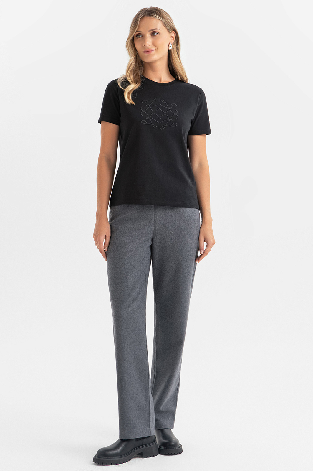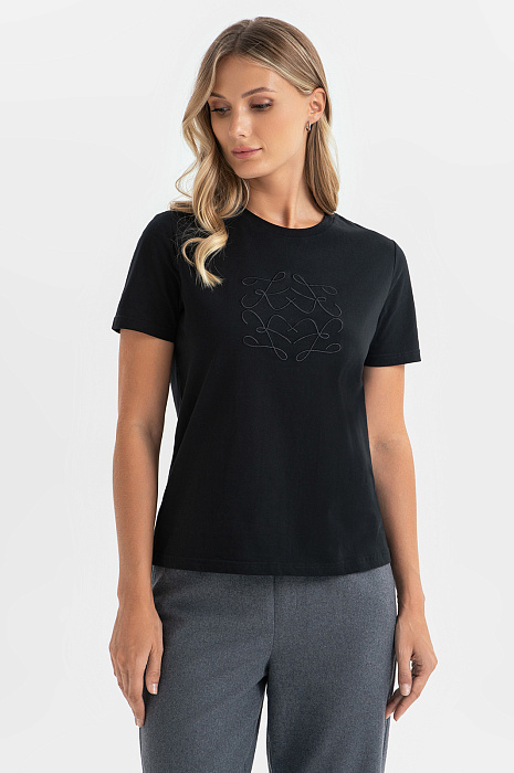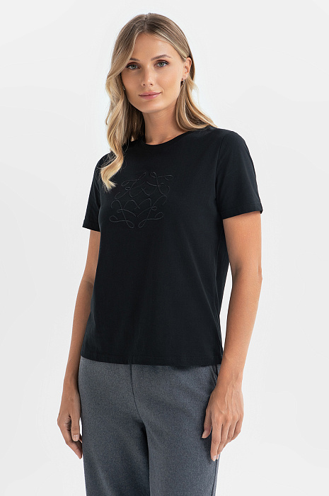 Практичная футболка на каждый день в черном цвете легко впишется в ваш повседневный гардероб. Для изготовления базовой модели с круглым вырезом мы использовали длинноволокнистый натуральный хлопок, дышащий и приятный в носке. Благодаря оригинальной вышивке на передней полочке изделие выглядит совсем не буднично. Футболку можно сочетать с джинсами или брюками из нашей коллекции. Параметры модели: рост 180, 87-61-91 Размер на модели: S