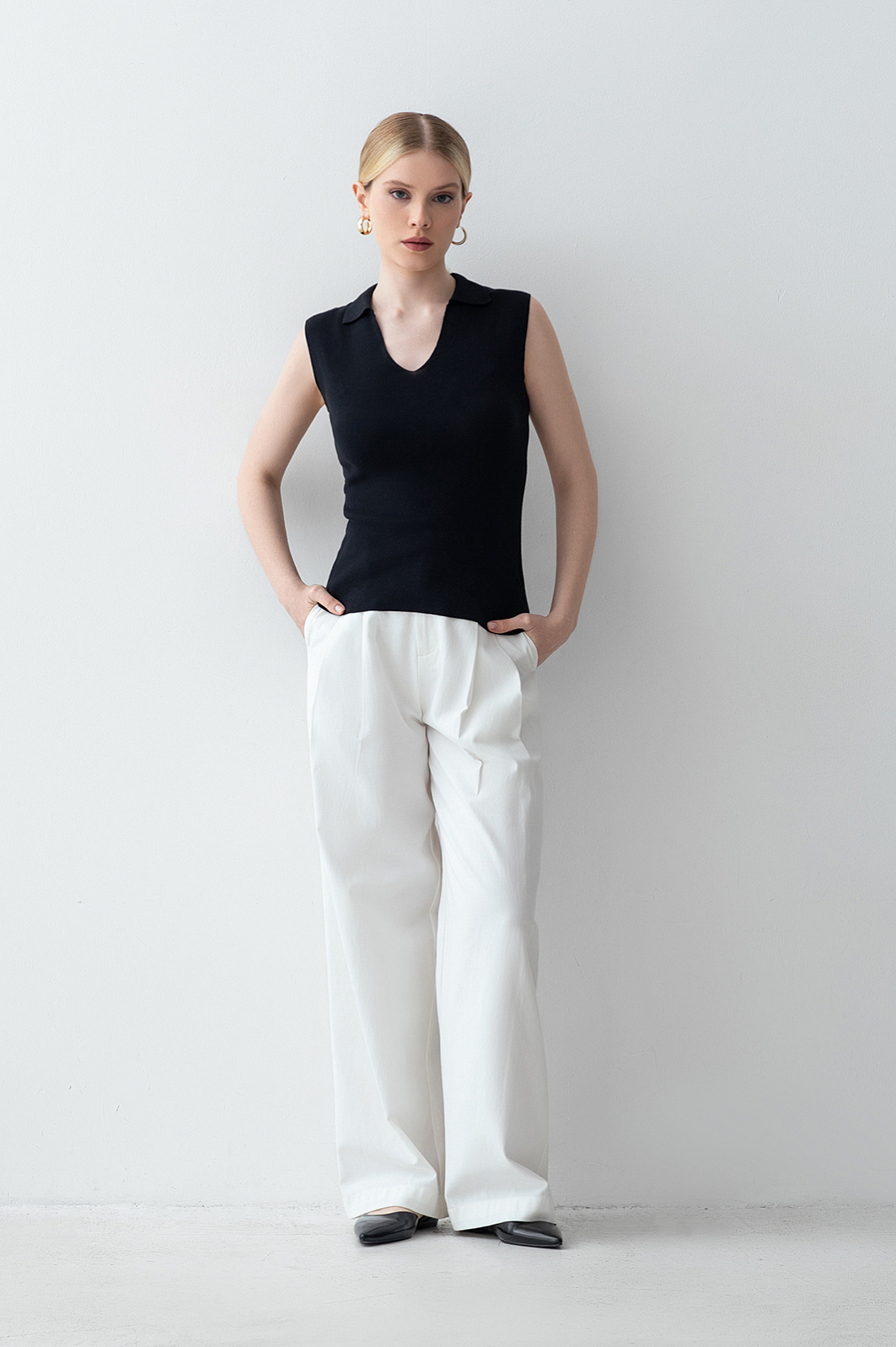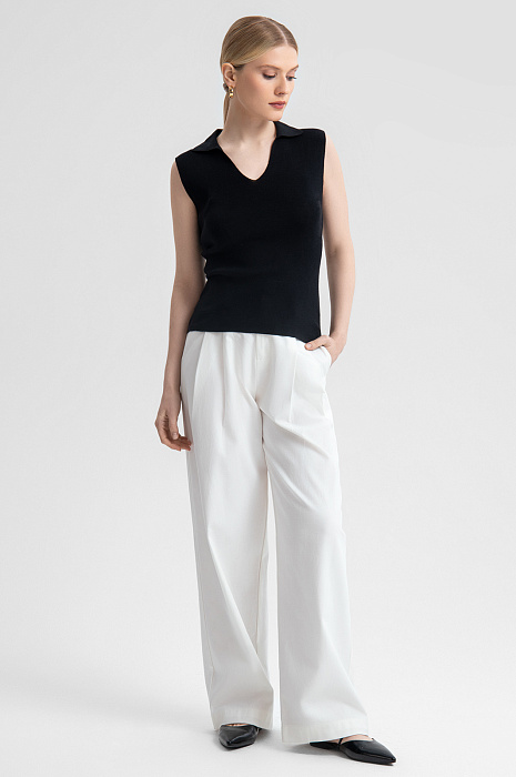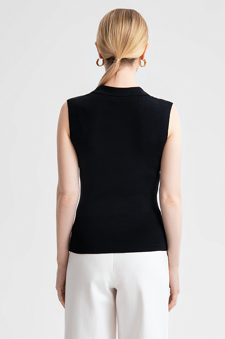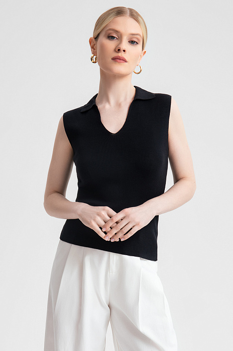 Изысканное поло KANZLER из 100% хлопка – универсальный выбор для классических и неформальных образов. Элегантный черный цвет и минималистичный крой создают идеальную базу для самых разнообразных сочетаний с брюками, юбками или шортами. Треугольный вырез и крой без рукавов подчеркивают линию шеи и плеч. Нежный материал из натуральных волокон хлопка дарит коже комфорт в течение всего дня, обеспечивая воздухопроницаемость и приятные тактильные ощущения. Модель устойчива к износу, легка в уходе и сохраняет форму и цвет надолго. Параметры модели: рост 175, 88-65-92 Размер на модели: S