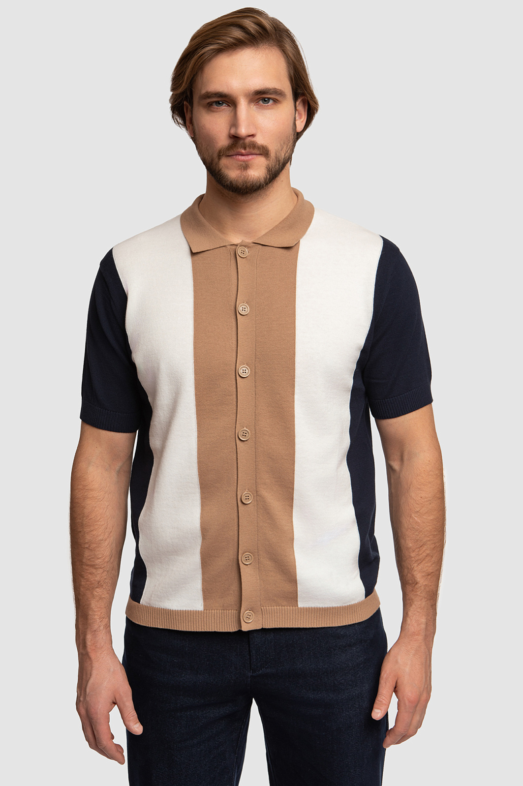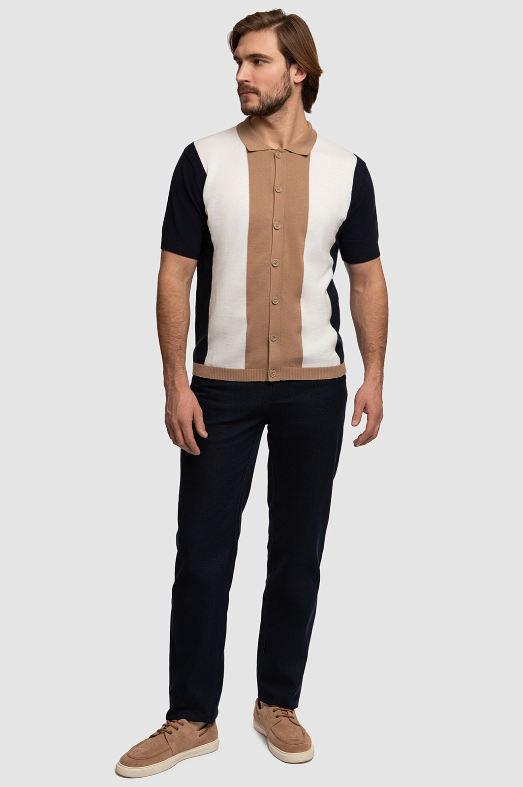 Дизайнеры KANZLER выполнили кардиган из тонкого хлопкового трикотажа, поэтому он согревает, не создавая дополнительный объем. Модель с отложным воротником — идеальный вариант обновить гардероб, построенный на благородных природных оттенках. Вязка в вертикальную широкую полоску смотрится деликатно и отлично поддержит общую стилистику изделия. Лаконичности и завершенности изделию добавляет фурнитура в тон, которая смотрится ненавязчиво. Для пошива модели использовали мягкий хлопковый трикотаж премиального качества. Наши стилисты советуют сочетать модель с коричневыми или белыми брюками, а также денимом в синем оттенке. Параметры модели: рост 187, 100-81-97 Размер на модели: M
