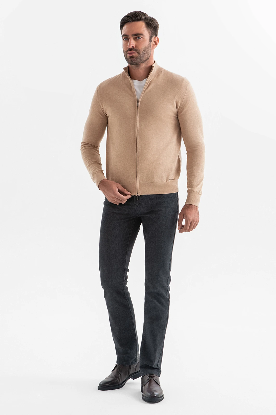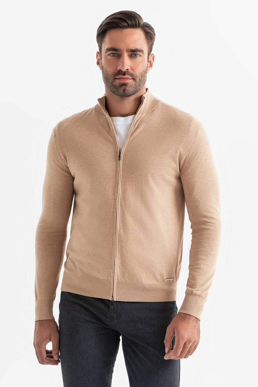 Кардиган KANZLER из 100% хлопка в песочном оттенке — базовая вещь, которая легко впишется в любой стиль. Нейтральный песочный цвет создает ощущение теплоты и осеннего уюта, а также сочетается как с яркими, так и с приглушенными оттенками. Натуральный состав из нежного дышащего хлопка прекрасно сохраняет тепло. Материал оптимален для любого сезона, позволяя коже дышать и поддерживая оптимальную температуру. Молния в тон кардигана подчеркивает минималистичный дизайн, обеспечивает комфорт и завершает лаконичный стиль изделия. Для идеальной посадки по фигуре дизайнеры предусмотрели трикотажную резинку внизу. Предлагаем дополнить образ графитовыми брюками или джинсами, белой футболкой и высокими ботинками. Параметры модели: рост 192, 108-83-102 Размер на модели: M