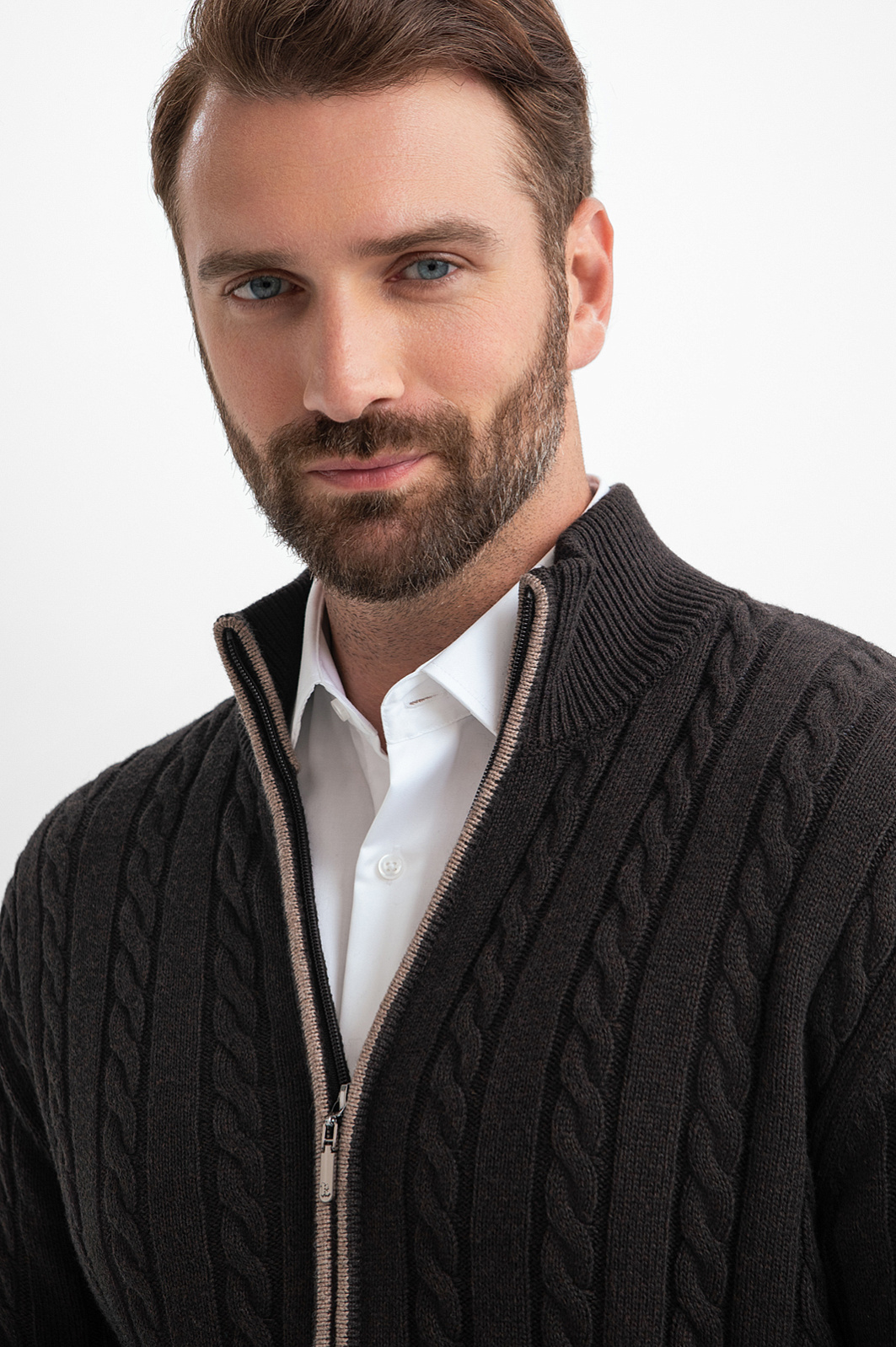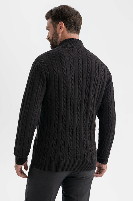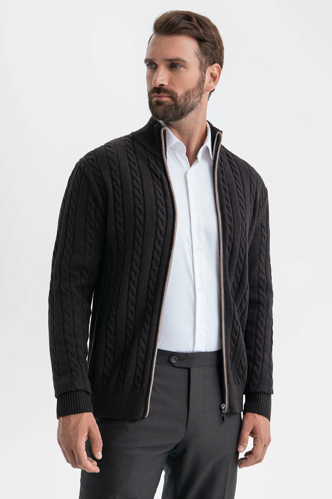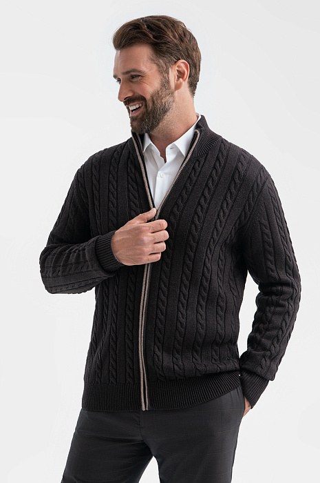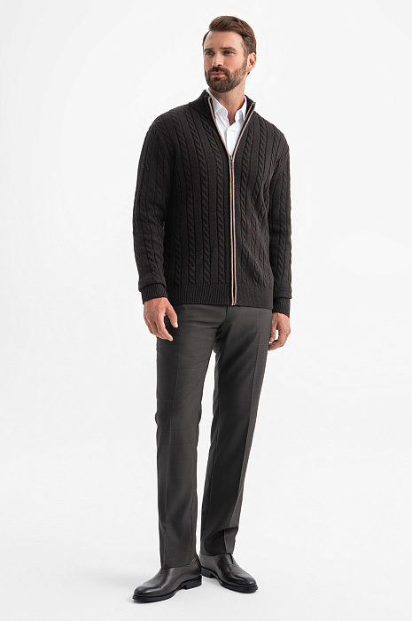 Коричневый кардиган KANZLER на молнии из хлопка и кашемира с объемными вертикальными косами — нарядная и уютная вещь, которая сделана с теплотой и заботой о Вашем комфорте. Модель смотрится безупречно и стильно, в том числе, и с деловой одеждой — офисными брюками и рубашками. Спокойствие коричневого цвета сочетается с мягкостью линий, декоративной вязкой и контрастной светло-серой полосой вдоль молнии. Теплый качественный трикотаж объединяет достоинства легкого воздушного хлопка и нежного кашемира. Ткань отлично сохраняет тепло в холодные дни, не допуская перегревания, и создает ощущение мягкого заботливого прикосновения. Параметры модели: рост 189, 102-80-99 Размер на модели: M