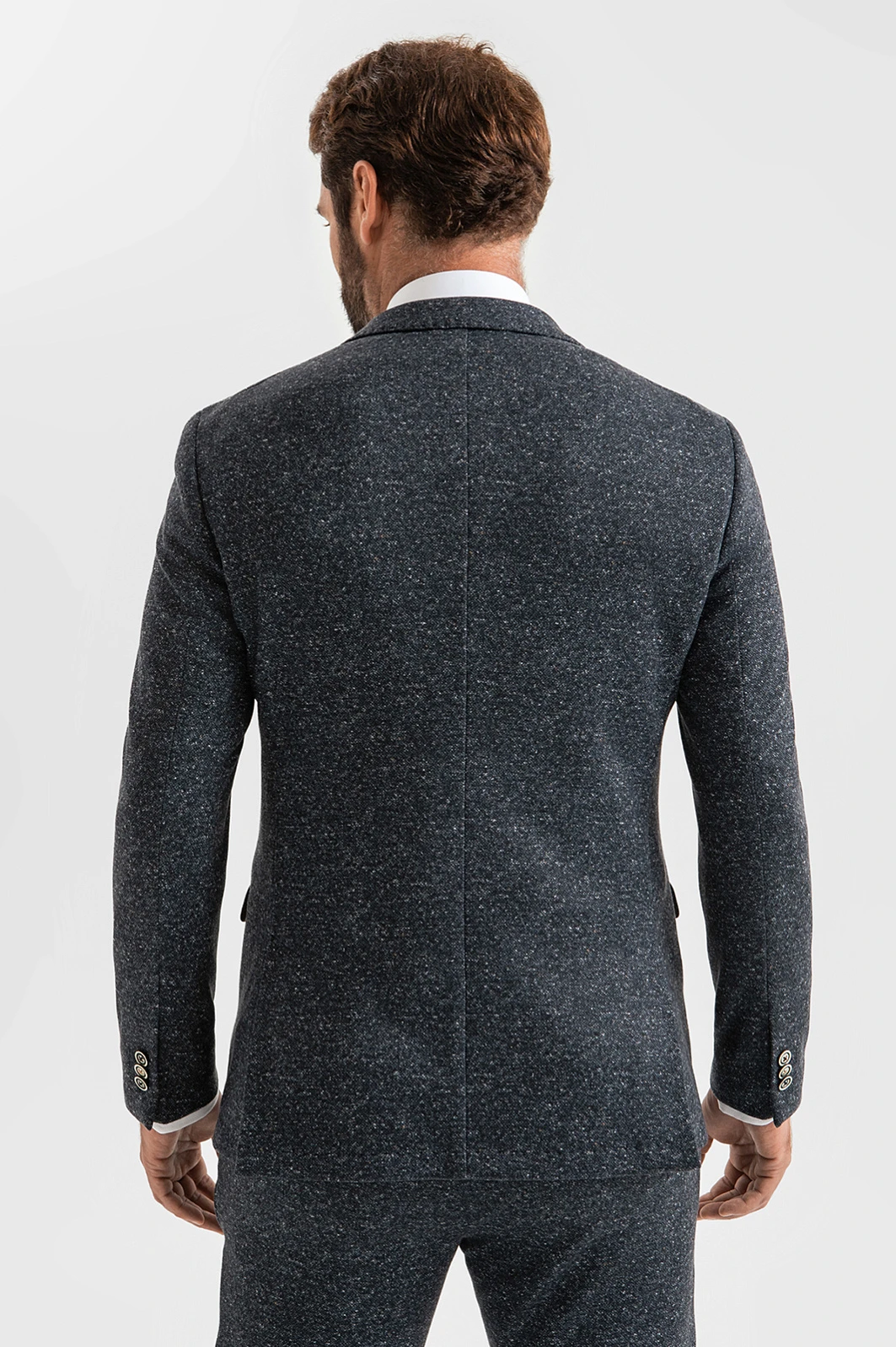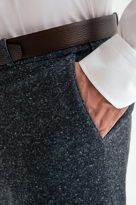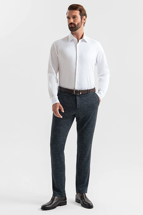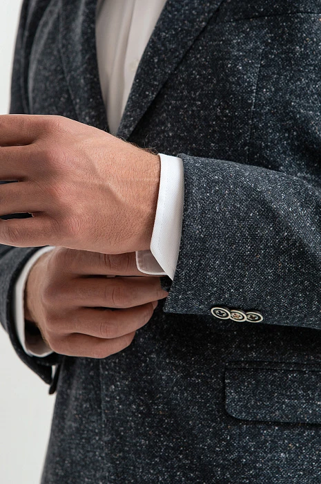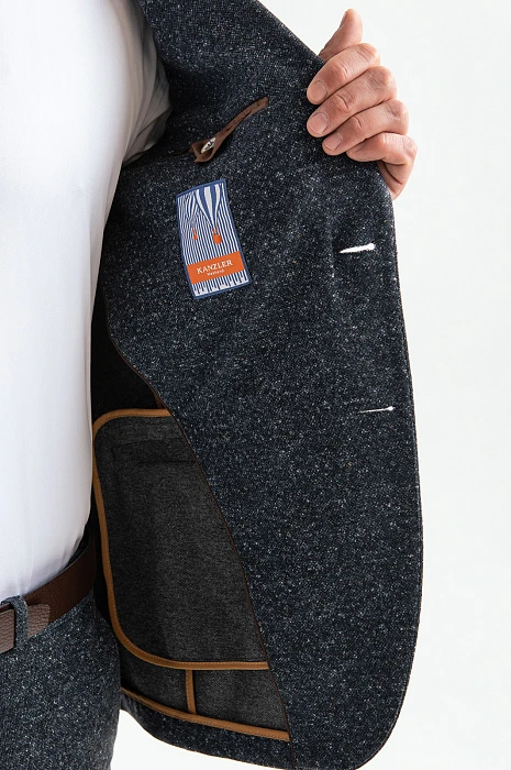 Пиджак и брюки KANZLER из плотного темно-синего хлопкового трикотажа с меланжевым эффектом — комфортный костюм, который не сковывает движений, подходит для работы и отдыха и при этом не лишен элегантности. Крой подчеркивает лучшее в мужской фигуре. Переплетение темно-серых и белых нитей придает материалу фактурность. Качественный трикотаж, из которого сшита двойка, отлично тянется, не мнется и сохраняет безупречную форму. Но главное — это дышащий материал, поэтому в костюме не бывает жарко. Для прочности и износоустойчивости натуральные волокна хлопка укреплены полиэстером.