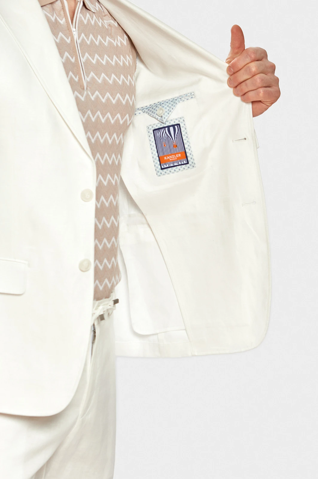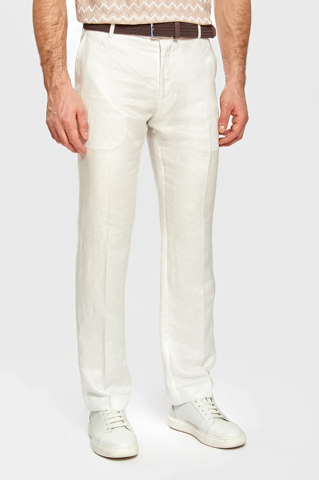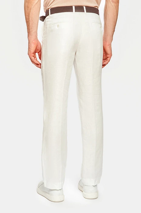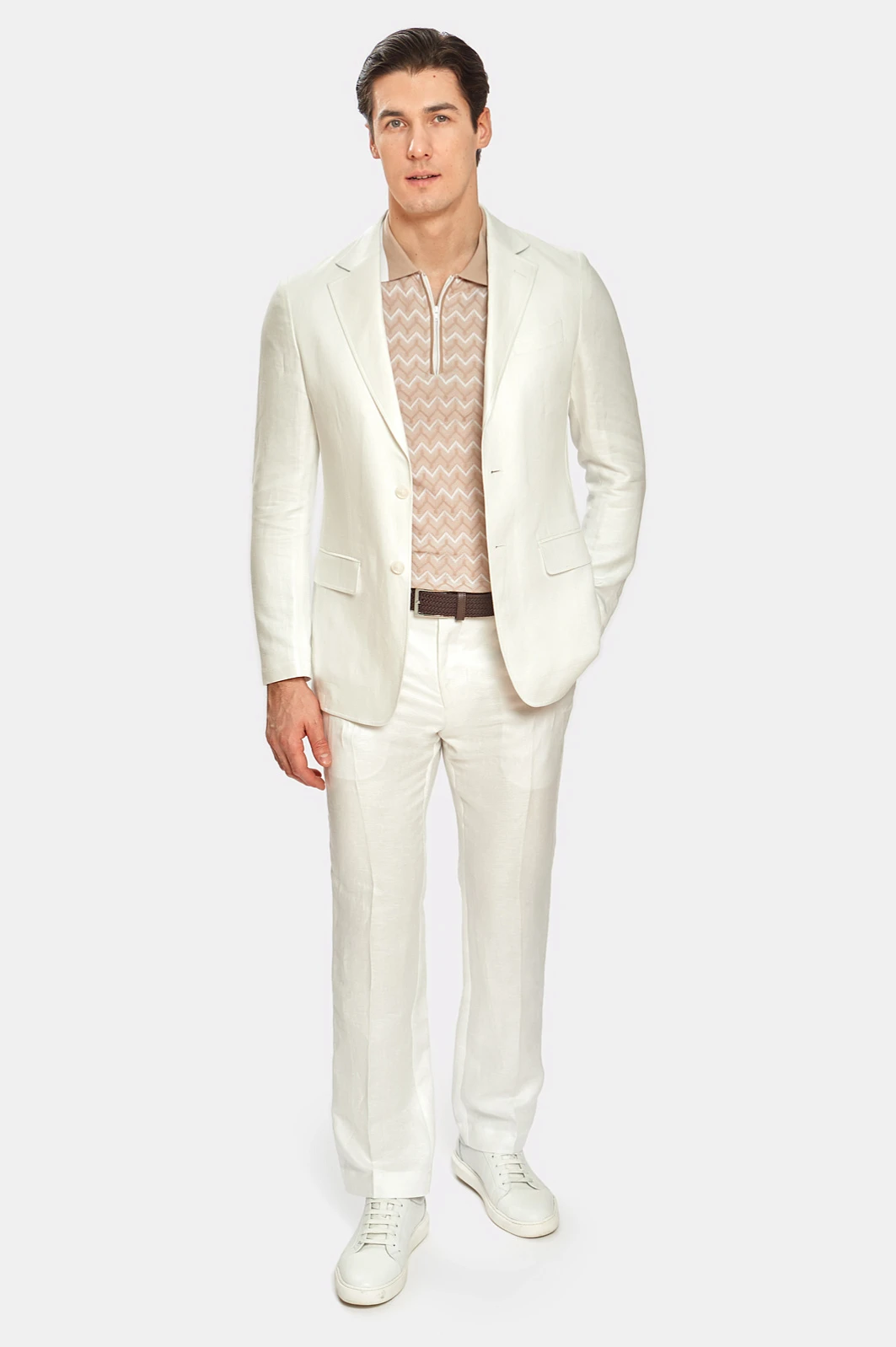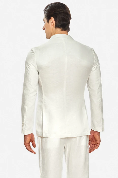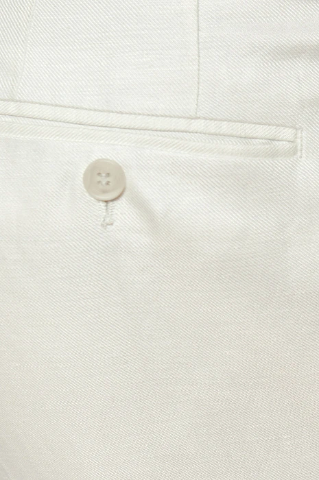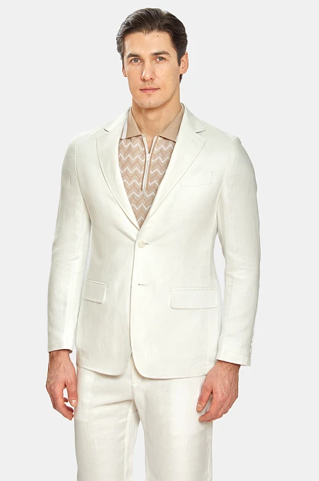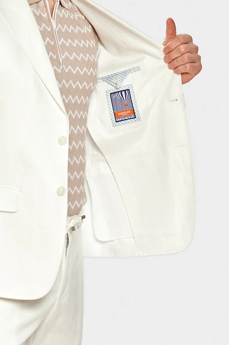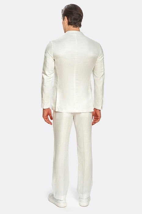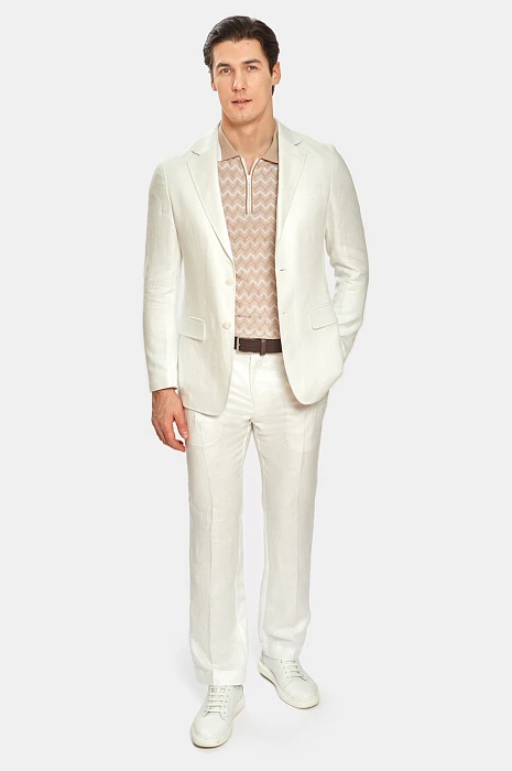 Чтобы выглядеть элегантно и чувствовать себя комфортно в летний период Выбирайте легкие костюмы изо льна. Белый лен придает любом образу определенный шик и шарм и белый льняной костюм из коллекции весна/лето 2022 можно вписать как в городской стиль, так и в пейзаж морского побережья. В состав добавили тенсел, который делает материал более мягким, пластичным и менее мнущимся. В комплекте: пиджак с отлётной фигурной подкладкой и два вида брюк. Обратите внимание, что Вы можете подобрать брюки классического кроя или брюки более расслабленной посадки на завязках.