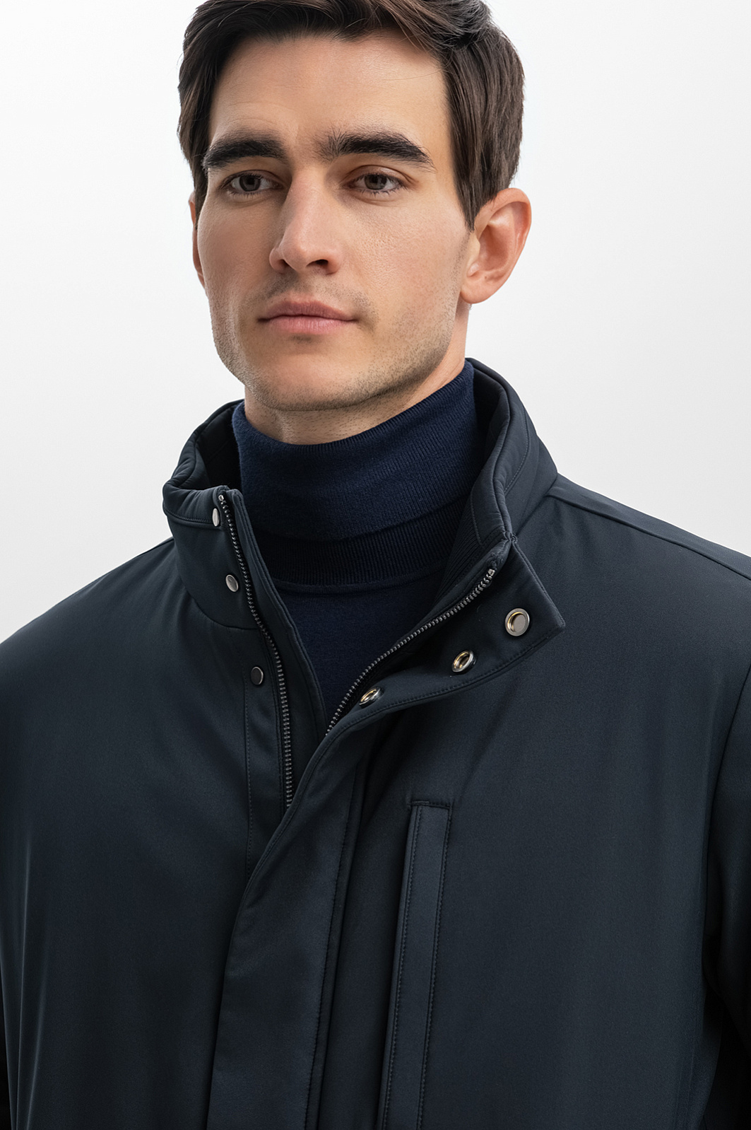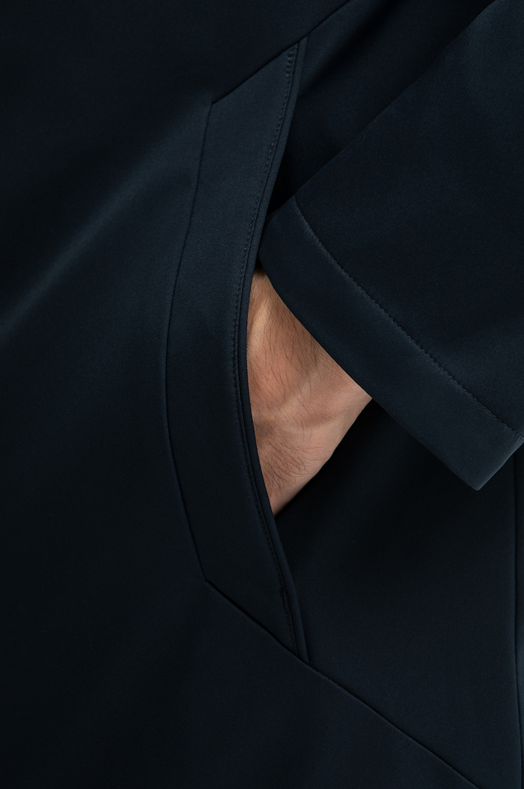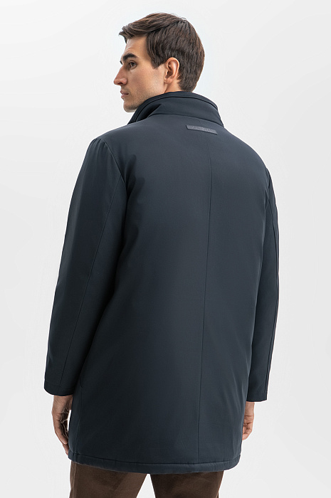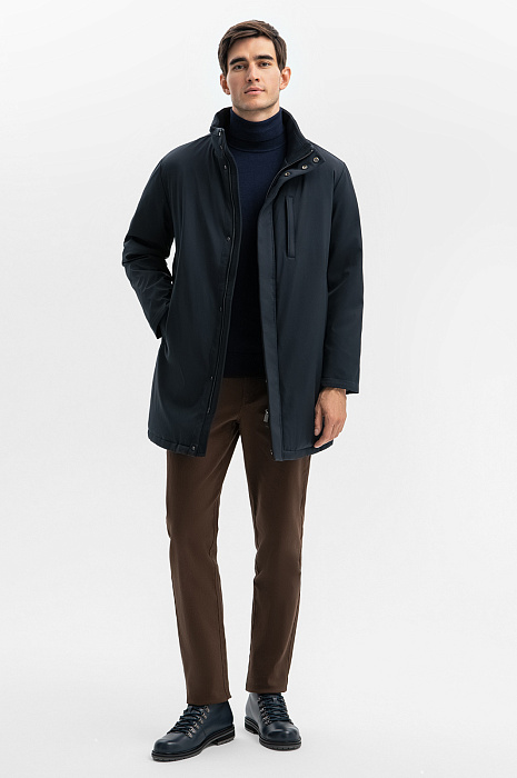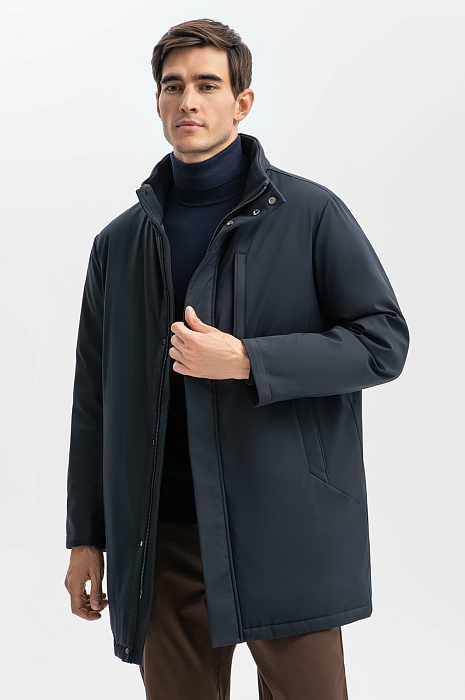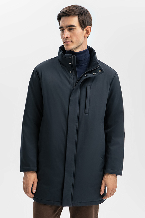 Лаконичная куртка удлиненного кроя с прямым силуэтом — идеальный выбор для ценителей минимализма и практичности. Базовый темно-синий цвет, отсутствие декора, молния, скрытая планкой - детали, которые обеспечивают универсальность для любого гардероба. Главное преимущество изделия — водоотталкивающая обработка. Водостойкость достигается за счет нанесения гидрофобного покрытия, благодаря которому капли воды скатываются с материала, не пропитывая его. Внутренняя горизонтальная стежка сохраняет тепло, обеспечивая комфорт в прохладную погоду, а длина чуть ниже бедра — оптимальна для повседневного ношения и подходит для деловых образов с пиджаком. Сзади расположен фирменный патч с логотипом бренда - брендированный акцент на стиль и изысканность. Для важных мелочей дизайнеры предусмотрели несколько карманов на молнии. Параметры модели: рост 192, 101-76-97 Размер на модели: 50