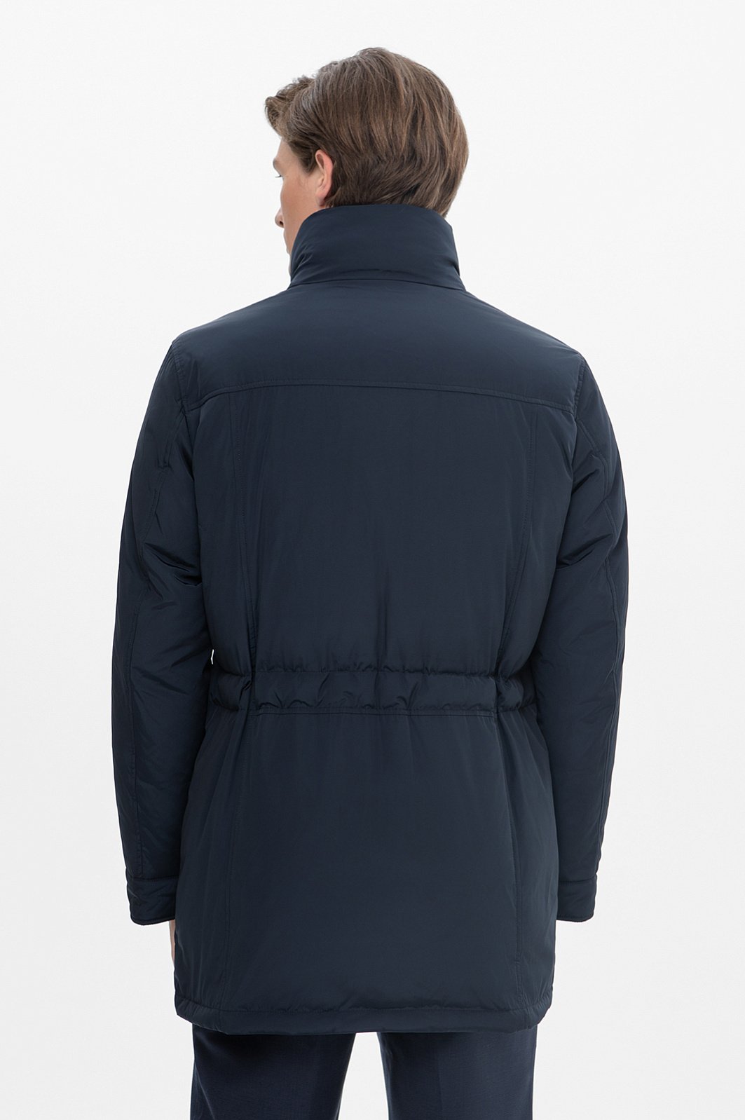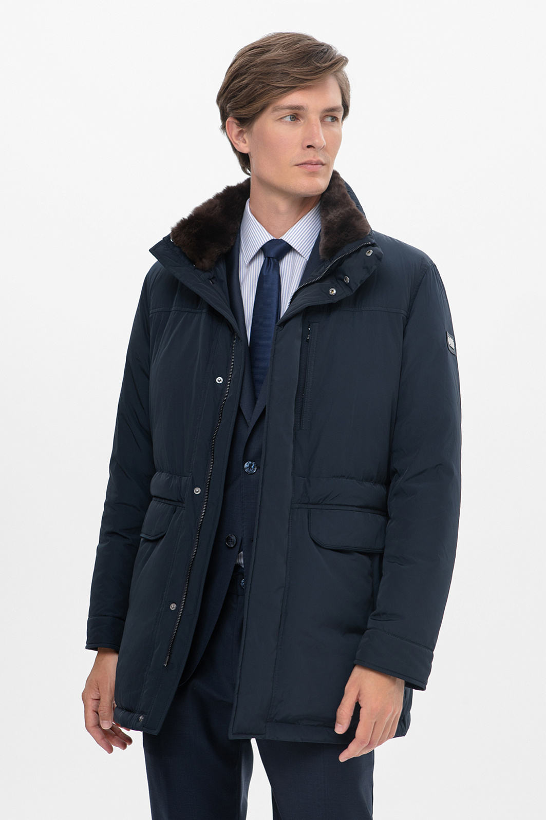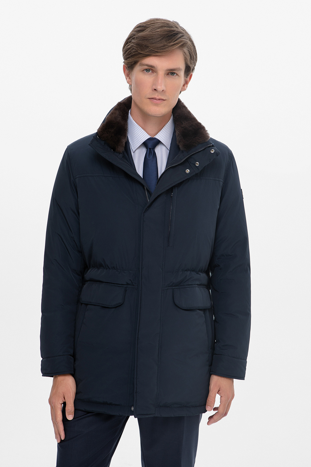 Пуховик KANZLER в благородном синем оттенке сочетает деловой стиль и технологичность, идеально подходя для морозных дней. Наполнитель из 90% пуха и 10% пера обеспечивает отличную теплоизоляцию и легкость. А специальная водоотталкивающая пропитка делает верхний слой (практичный крепкий смесовой материал из полиэстера) совершенно неуязвимым для дождя и мокрого снега. Утепленный воротник обеспечивает надежную защиту от холода, а строгий дизайн делает модель подходящей для делового стиля, легко комбинируясь с классическими брюками. Кулиска на талии позволяет регулировать прилегание и обеспечивает комфортную посадку. Застежка на молнии скрыта под планкой с металлическими кнопками, что добавляет лаконичности и изысканности. Для хранения важных мелочей дизайнеры предусмотрели вместительные накладные карманы с клапанами. Этот пуховик — идеальный выбор для тех, кто ценит комфорт, тепло и элегантный внешний вид в любую погоду. Параметры модели: рост 191, 97-77-99 Размер на модели: 50