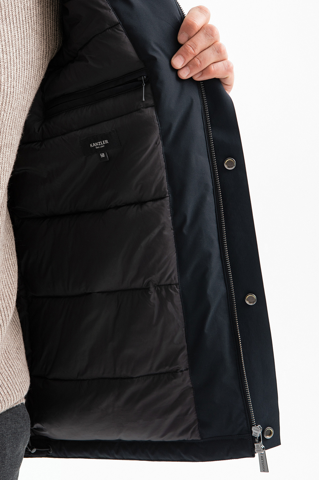 Универсальная черная куртка KANZLER с утепленными воротником-стойкой и капюшоном позволит наслаждаться свежим воздухом при любой погоде. Модель отлично сочетается с одеждой в деловом, повседневном и спортивном стилях. Большие накладные карманы, прикрытые клапанами с кнопками, придают модели брутальный вид. Прочный верхний слой с водоотталкивающей обработкой и широкая планка с кнопками, прикрывающая застежку-молнию, делают куртку неуязвимой для дождя и ветра. Теплая подкладка из полиэстера бережет тепло тела. Степень прилегания капюшона регулируется зажимом для шнурка. Внутри имеется большой карман на молнии — для документов и бумажника. Параметры модели: рост 189, 102-80-99 Размер на модели: 50