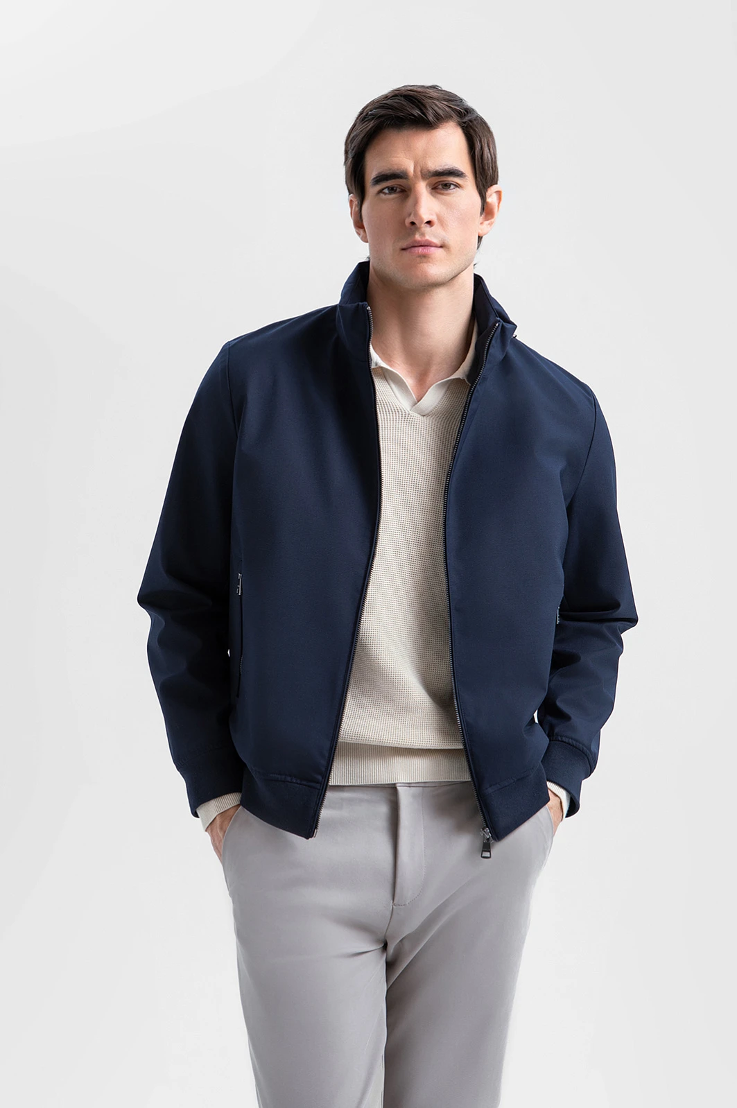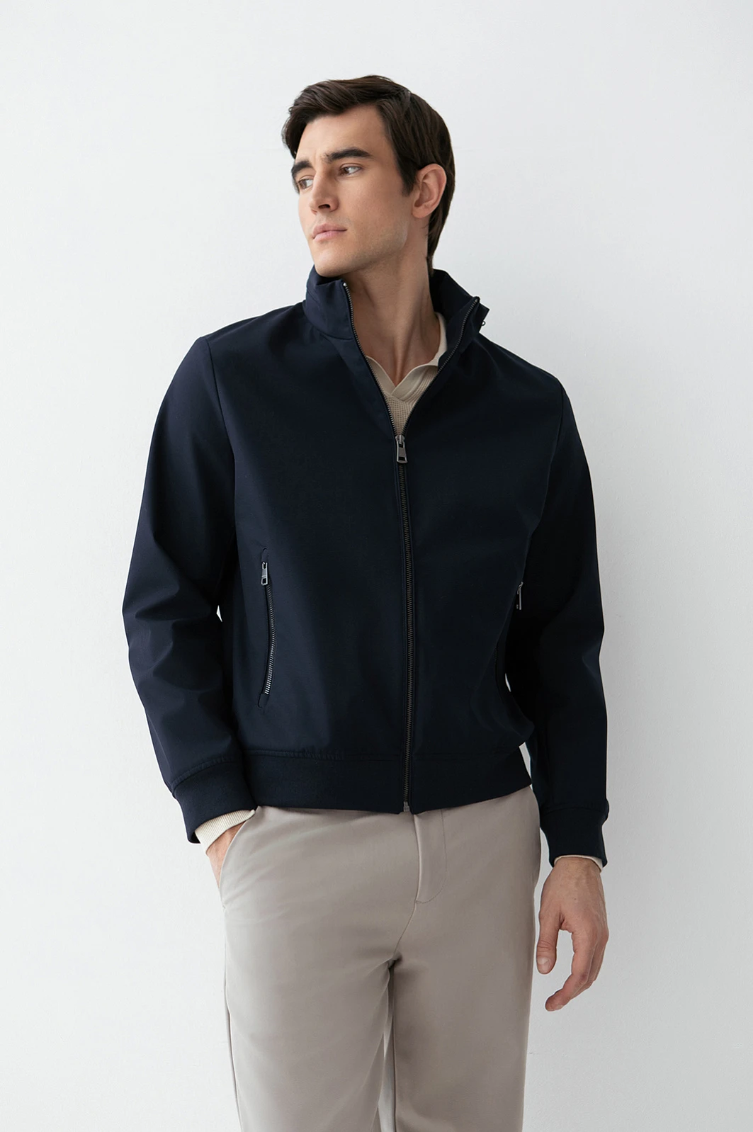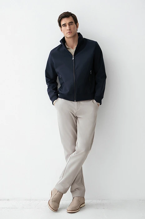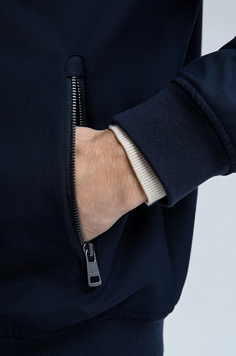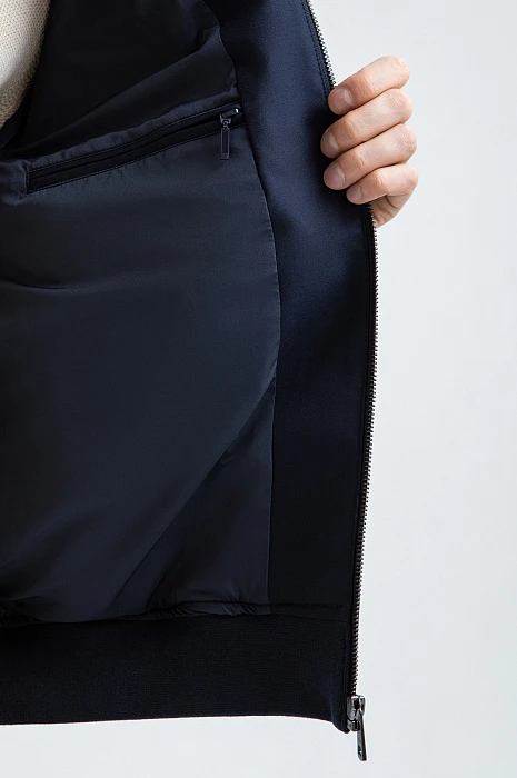 Стильная тёмно-синяя куртка KANZLER из смесовой шерсти с эластичными манжетами и прорезными карманами на молнии интерпретирует эстетику канонического бомбера. Это удобная современная модель, которая гармонично сочетается с повседневными брюками, джинсами и базовыми футболками. Детали функциональны: воротник-стойка и плотные трикотажные резинки на рукавах и по низу создают надёжный барьер от ветра. Специальная водоотталкивающая обработка позволяет материалу сохранять безупречный вид в сырую погоду. Тёплая смесовая ткань (натуральная шерсть с полиэстером) надёжно защищает от холода в межсезонье и прохладные дни.