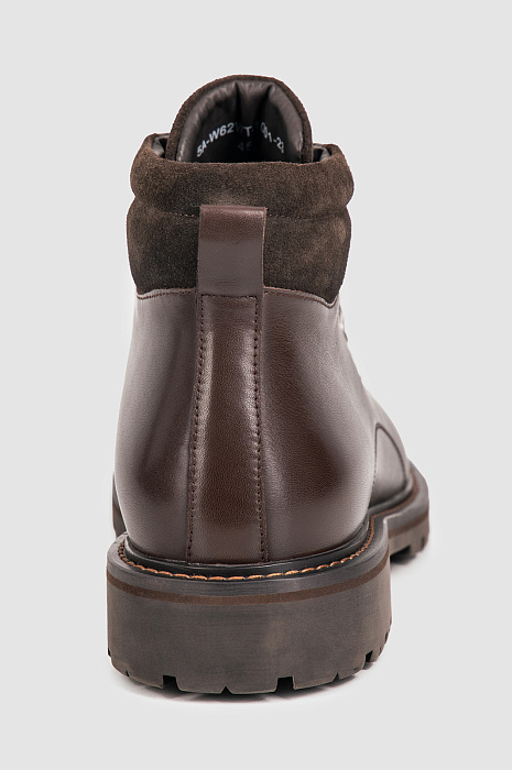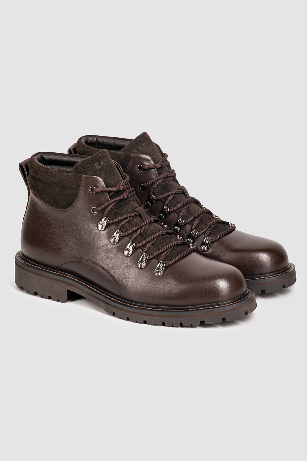 Ботинки KANZLER шоколадного оттенка из прочной гладкой кожи с замшевыми деталями — самая удобная повседневная обувь как для поездок и путешествий, так и жизни в городе в условиях переменчивой погоды. Надежная универсальная модель не теряет качеств горных ботинок благодаря прочному верху из качественной кожи и толстой рифленой подошве из резины, которая обеспечивает хорошее сцепление с любой поверхностью. Ботинки можно носить с комфортом длительное время: внутренняя кожаная подкладка не препятствует циркуляции воздуха. Стелька сделана из микрофибры — износоустойчивого материала, который хорошо впитывает влагу.