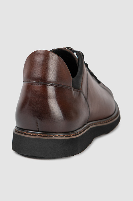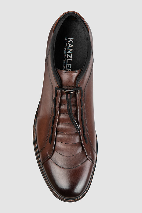 Стильные современные полуботинки KANZLER из гладкой коричневой кожи превосходной выделки адресованы любителям городского стиля. Классическая форма сочетается с оригинальными деталями — выступающим задником, необычной шнуровкой и фиксатором шнурков. Непревзойденный комфорт для ног обеспечивают внутренний слой и стелька из натуральной кожи — приятного дышащего материала. Слегка утолщенная резиновая подошва обладает необходимой амортизацией и хорошим сцеплением с сухой и влажной поверхностями. Идеально для любой погоды!