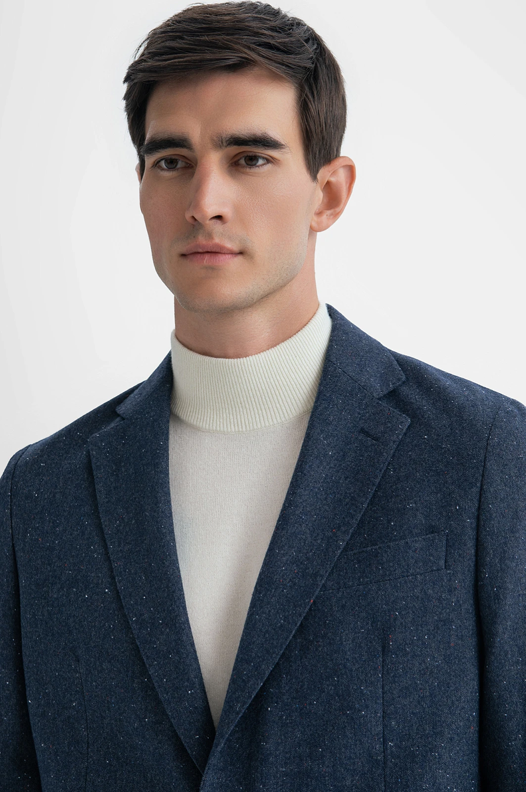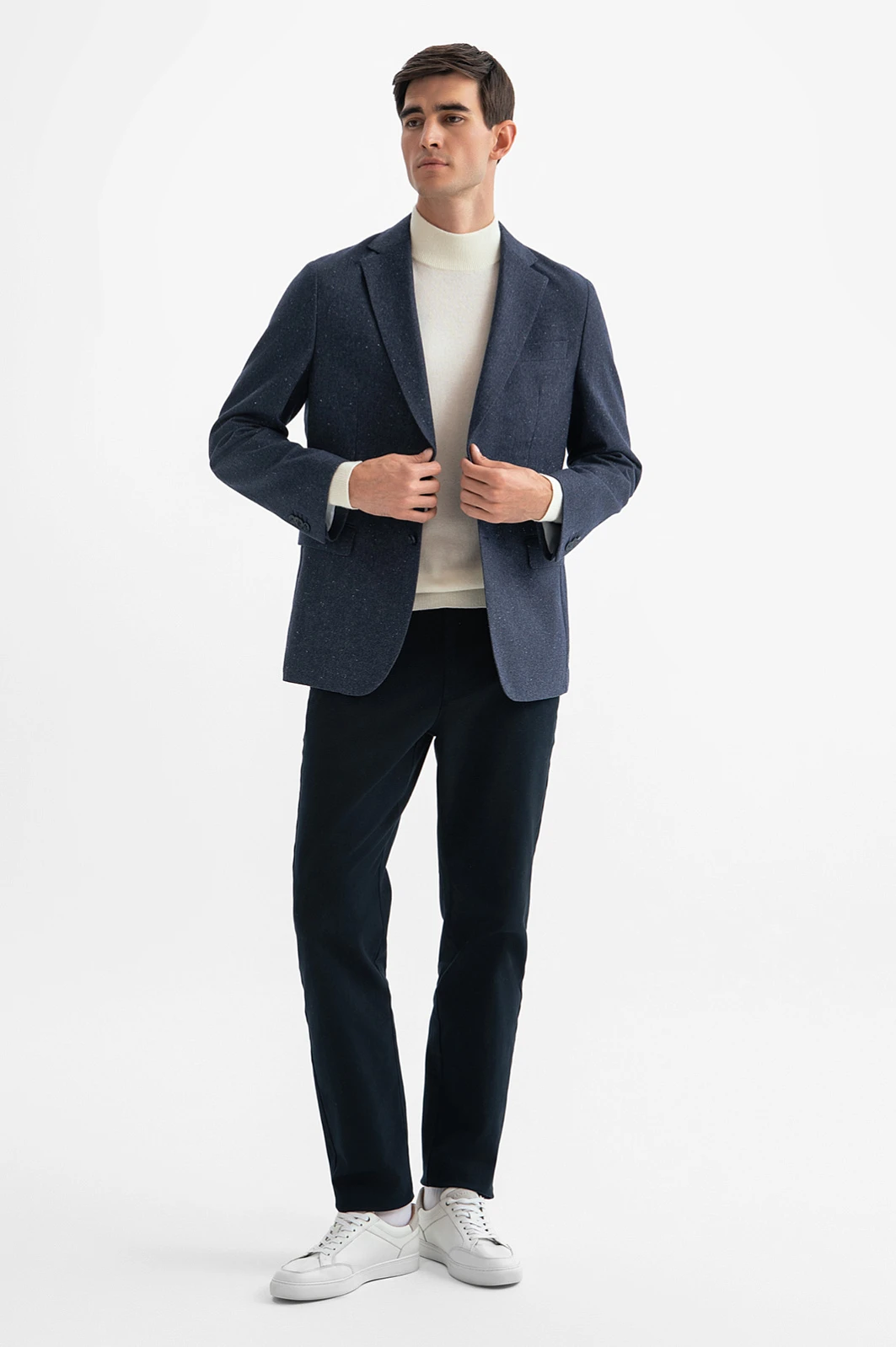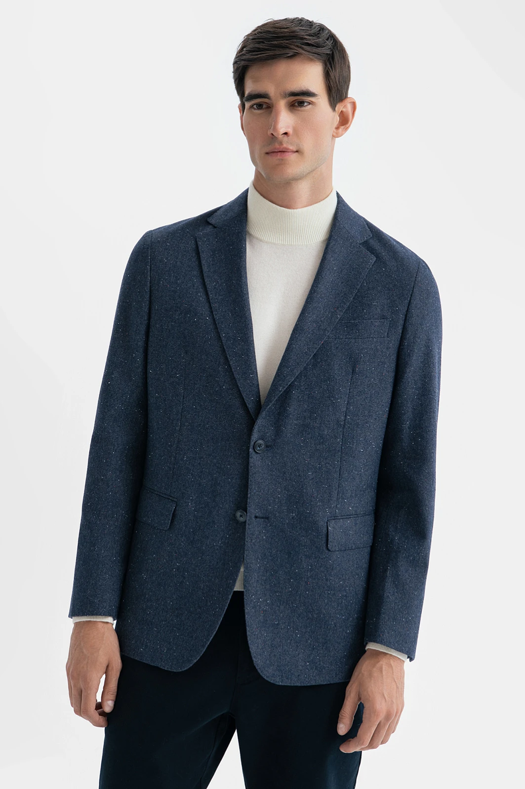 Раскрываем офисный стиль по-новому с пиджаком в стиле кежуал, добавляя нотку современности в гардероб. Если ваш офисный дресс-код позволяет больше свободы в выборе одежды, обратите внимание на эту модель в благородном синем оттенке. Плотный смесовый материал (42% хлопок, 36% шерсть, 22% полиэстер) сохраняет тепло, обеспечивает долговечность, комфорт и простоту ухода. Цветные вкрапления и накладные карманы придают образу непринужденность. Дополните образ белой водолазкой или джемпером и брюками. Параметры модели: рост 192, 101-76-97 Размер на модели: 50