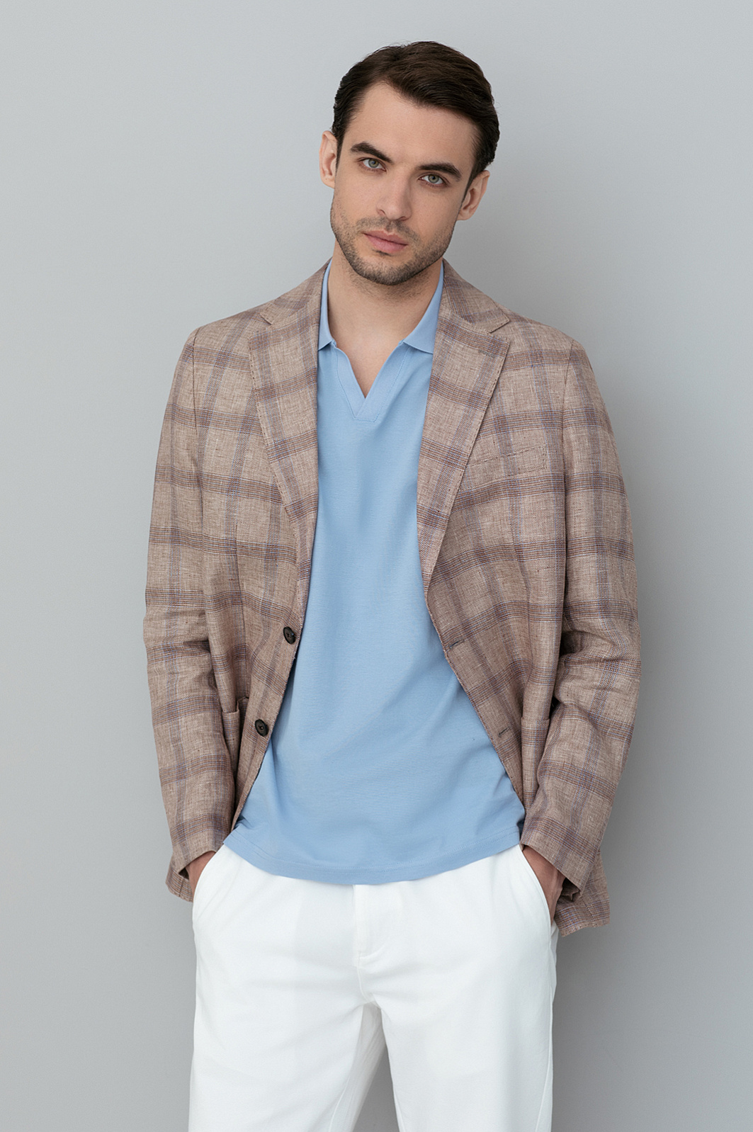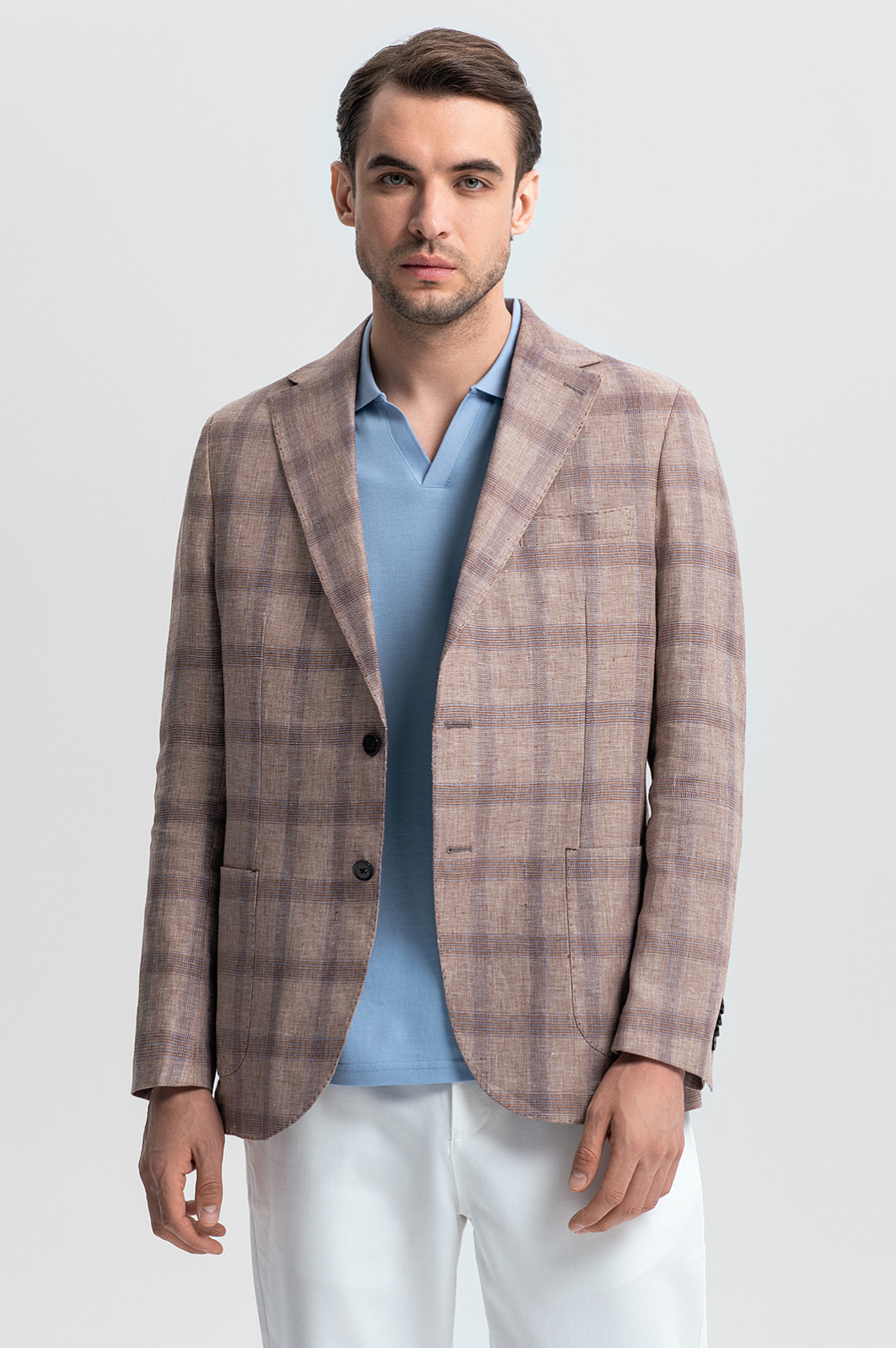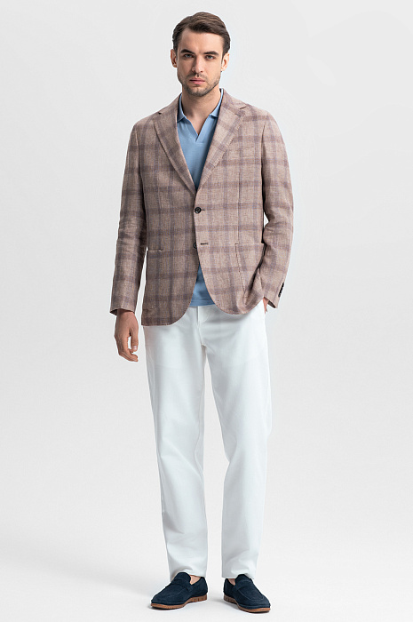 Светло-коричневый пиджак KANZLER – симбиоз элегантности и расслабленного европейского стиля. Классическая однобортная модель с мягкими скругленными линиями карманов и подола создает универсальный образ для деловых встреч, города и путешествий. Материал – 100% благородный натуральный лен – дарит ощущение прохлады в жаркий день и сохраняет тепло в ветреную погоду. Классический крой со свободным прилеганием подходит для любого типа фигуры, легко комбинируется с рубашками, поло и футболками и обеспечивает комфорт, не стесняя движений. Светло-коричневый оттенок, напоминающий песчаные дюны, дополнен графичным узором «оконная рама» – классической клеткой, которая визуально вытягивает силуэт и добавляет образу динамики. Натуральный состав, безупречный крой и дизайн вне времени – модель станет инвестицией в весенне-летний гардероб. Параметры модели: рост 191, 101-79-101 Размер на модели: 50