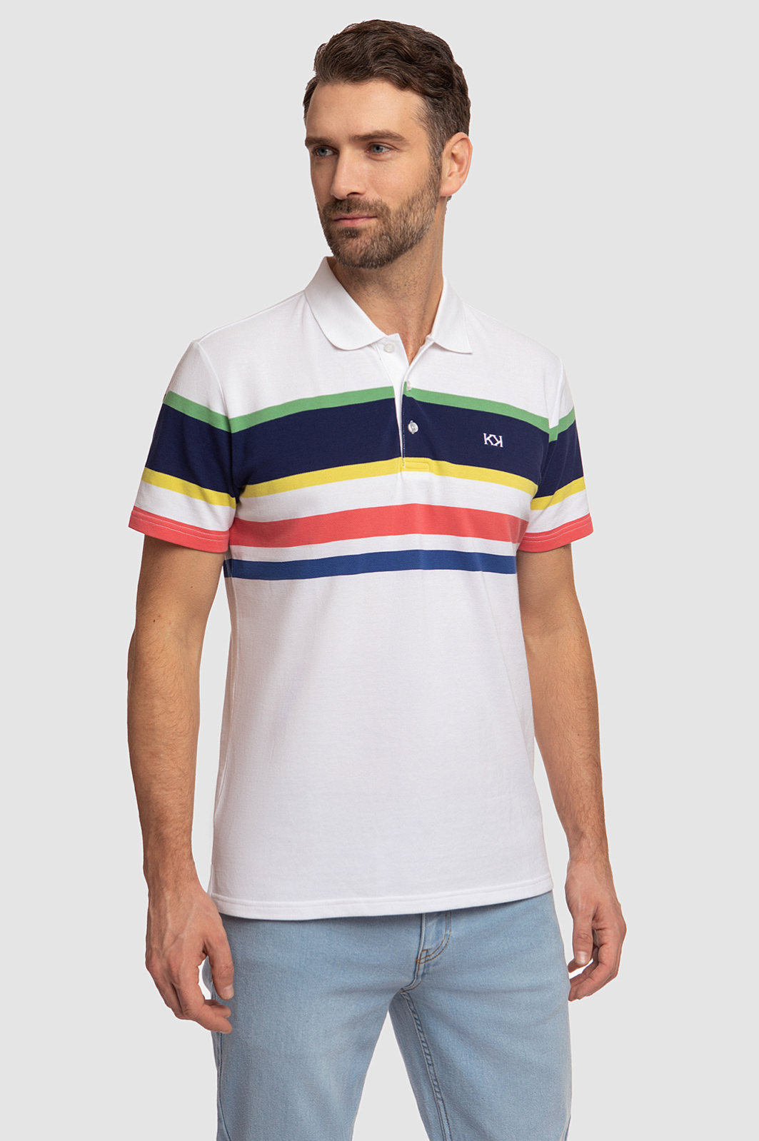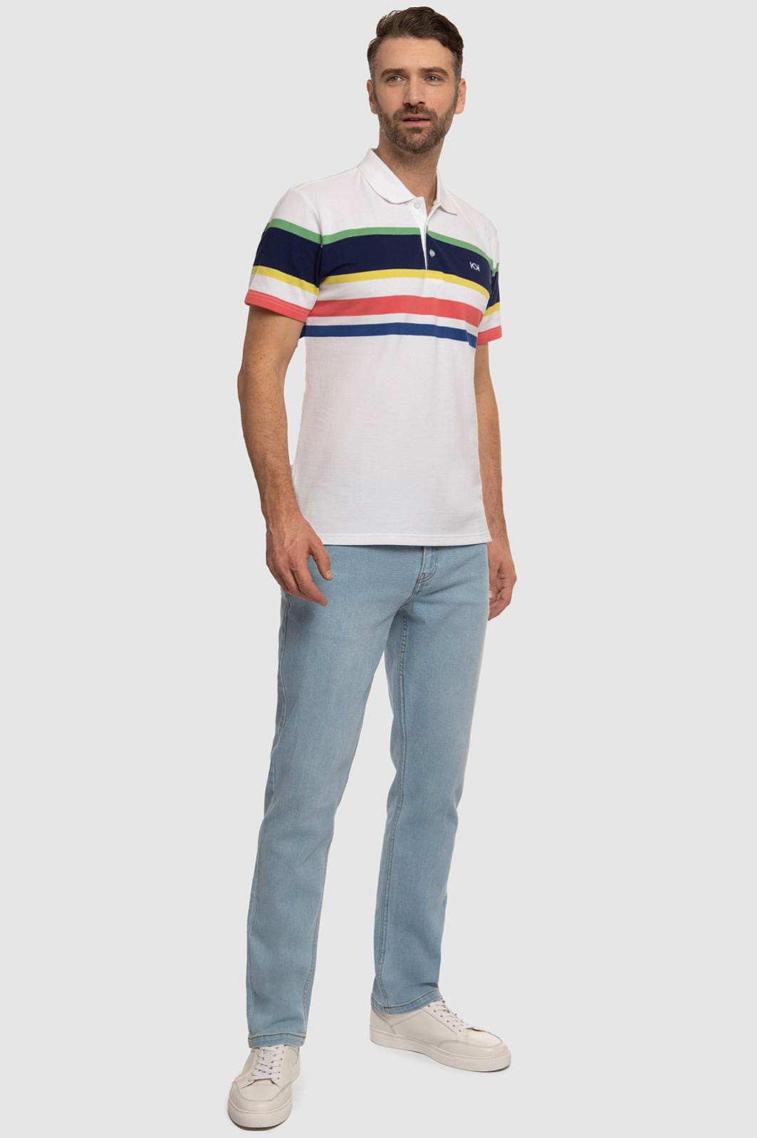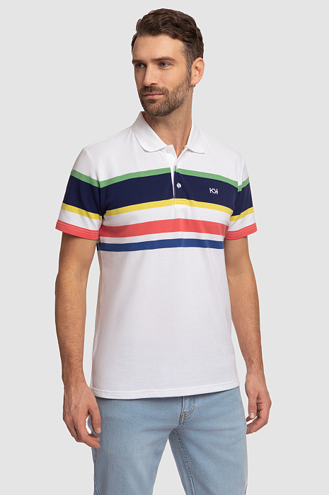 Поло KANZLER прямого кроя с отложным воротником станет ярким акцентом мужского образа. Модель получилась одновременно комфортной, практичной и современной. Благодаря цветным геометричным полоскам поло выглядит ярко и свежо, а основное белое полотно позволяет изделию легко сочетаться с другими элементами гардероба. С полосками спереди отлично рифмуется вышитый логотип бренда в виде двойной заглавной буквы K. Дизайнеры сшили его из мягкого хлопкового трикотажа. Шелковистый на ощупь натуральный хлопок хорошо тянется, поэтому изделие комфортно садится по фигуре и не сковывает движения. Советуем дополнить образ прямыми джинсами. Параметры модели: рост 189, 102-80-99 Размер на модели: М