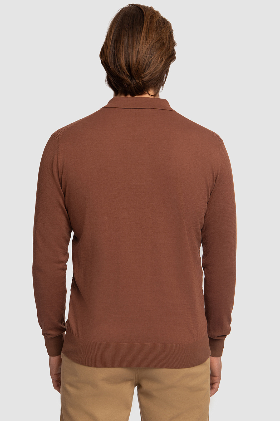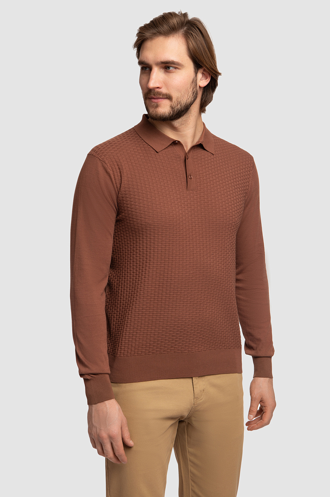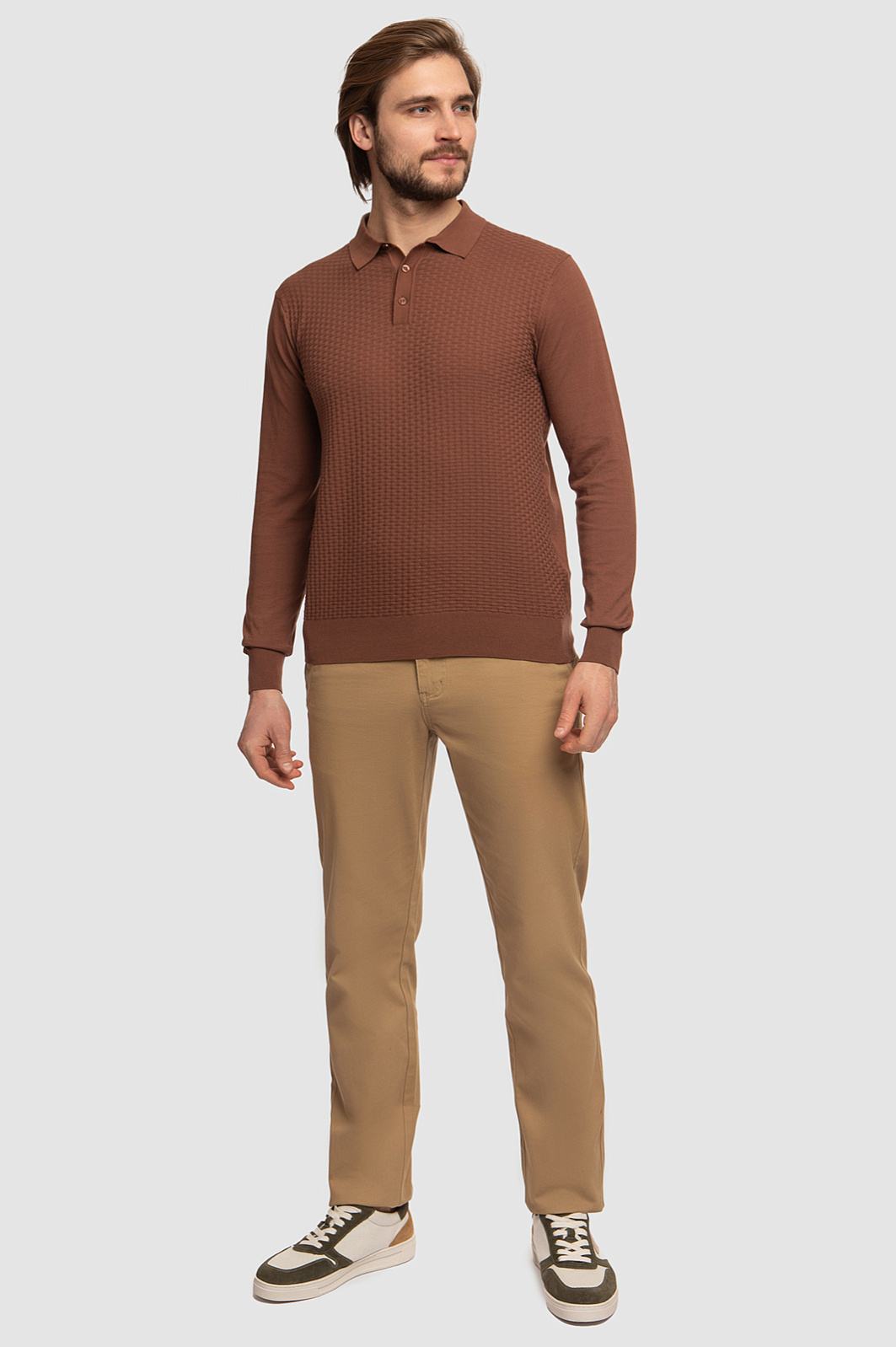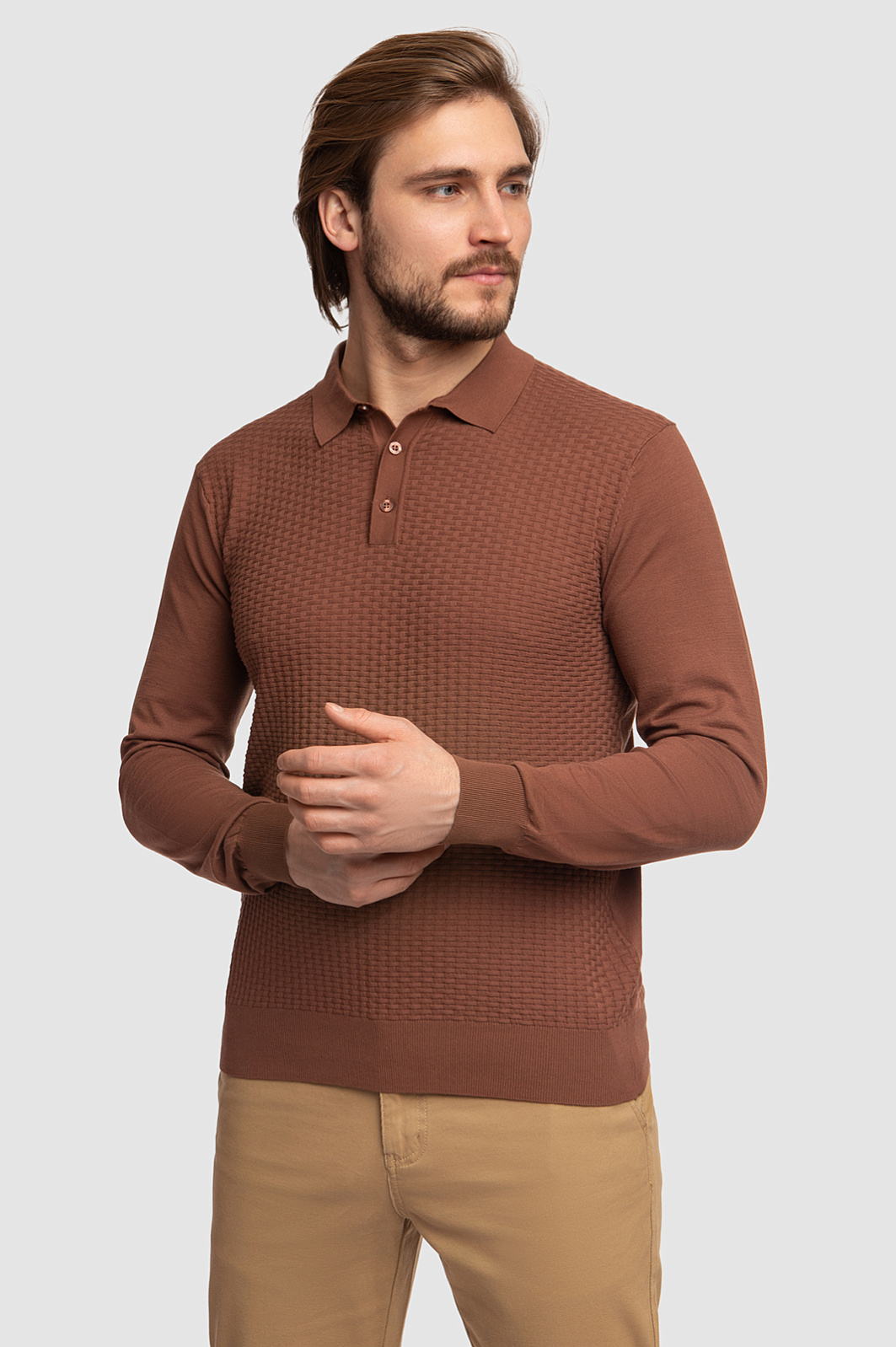 Дизайнеры KANZLER сделали коричневое поло прямого кроя едва ощутимым на теле. Для пошива изделия с отложным воротником и трикотажными манжетами выбрали особенно тонкий трикотаж из длинноволокнистого хлопка с геометричным узором. Легкий, дышащий материал получился шелковистым, особенно нежным и приятным на ощупь. Поло поддерживает оптимальную терморегуляцию и приятно ощущается на теле. Особого внимания заслуживает благородный цвет. Сложный, сдержанный, глубокий оттенок капучино. С поло можно собрать невероятно красивые монохромные образы, а лаконичный дизайн позволяет модели найти общий язык и с темными джинсами, и со светлыми брюками. Параметры модели: рост 187, 100-81-97 Размер на модели: M
