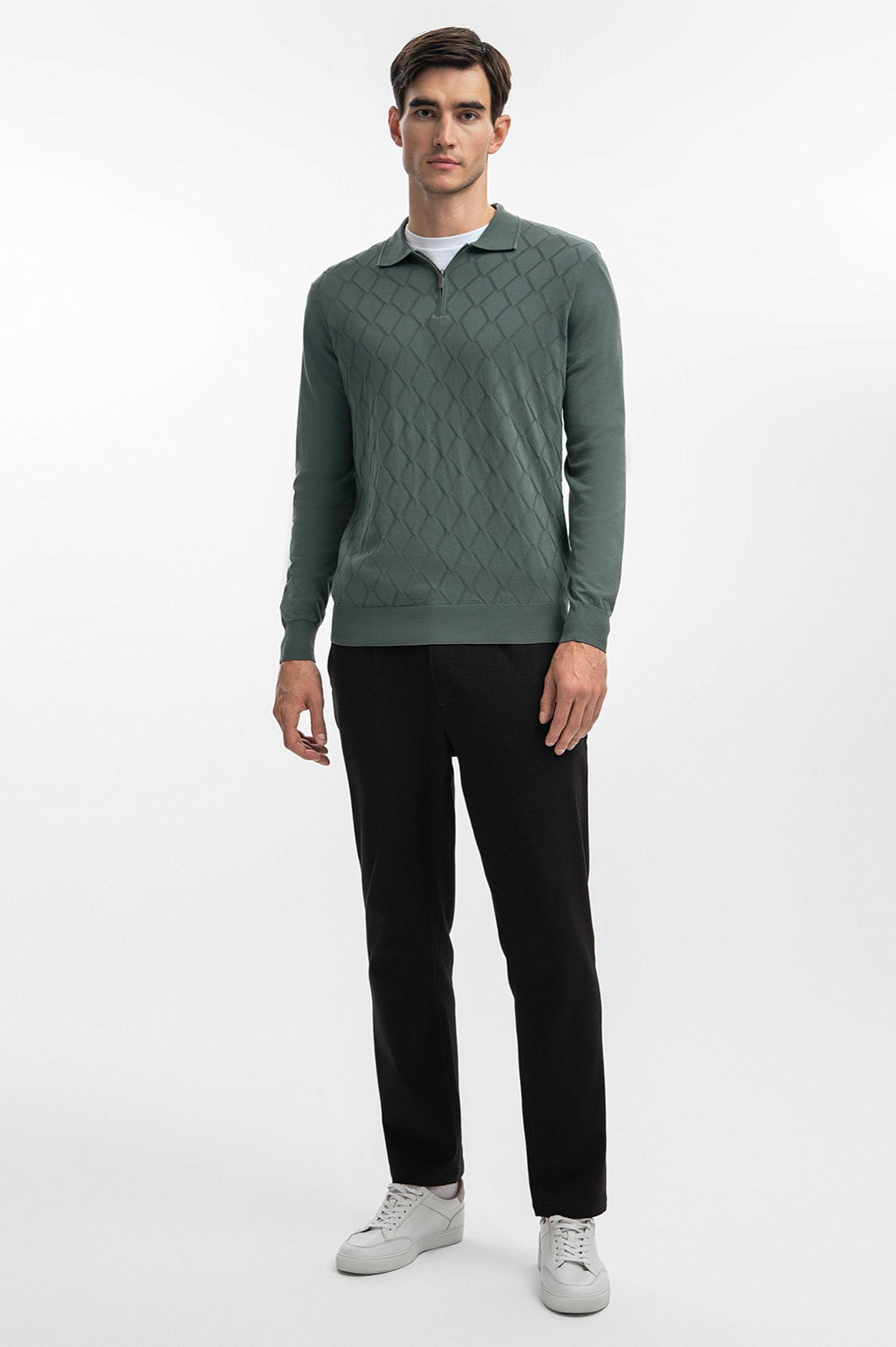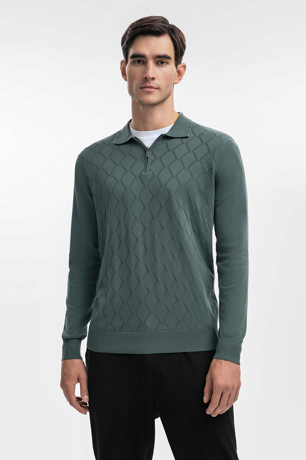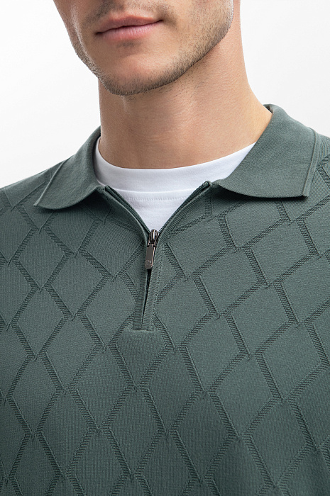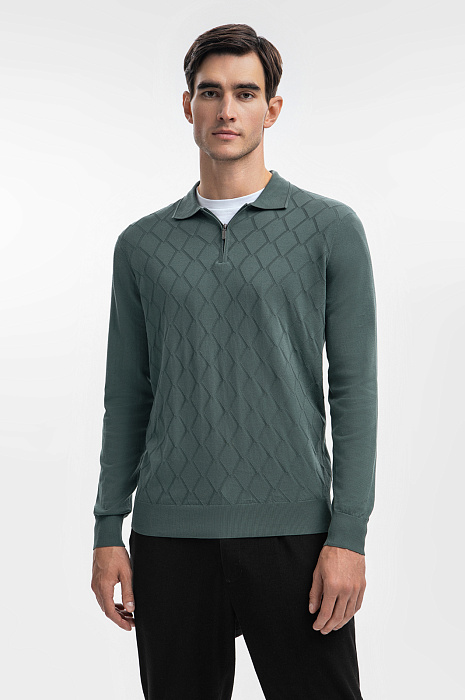 Поло KANZLER в трендовом бутылочном оттенке — это идеальный выбор для тех, кто ценит комфорт в повседневной жизни. Модель с отложным воротником выполнена из тонкого хлопка, который обеспечивает свободу движений и позволяет коже дышать. Длинный рукав, застежка на молнию, тонкая геометричная вязка - получилась лаконичная модель с интересным акцентом. Наши стилисты рекомендуют создать многослойный комплект с белой футболкой и дополнить его пиджаком — так образ будет выглядеть современно и гармонично. Сзади изделие украсили небольшим брендированным патчем. Параметры модели: рост 192, 101-76-97 Размер на модели: M