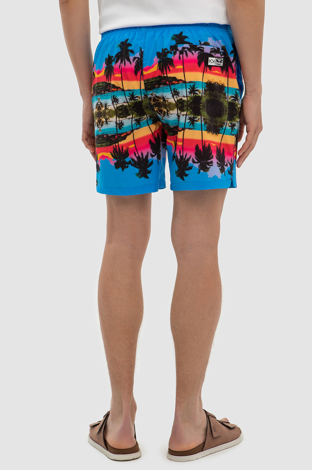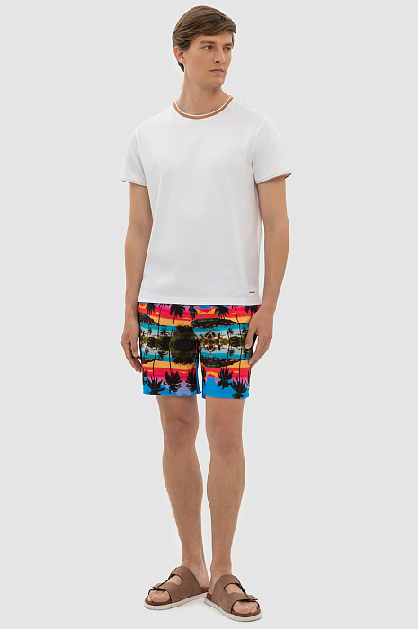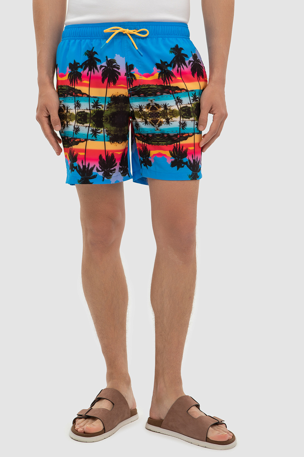 Пляж с бирюзовым морем - идеальная обстановка для моделей из летней коллекции KANZLER, в которой появились яркие шорты длиной чуть выше колена. Бирюзовые плавки делают еще ярче принт с изображением лазурного берега и солнечных пальм. Дизайнеры продумали все для комфортного отдыха и купания: на широком поясе предусмотрели регулируемую кулиску, делающую посадку на талии плотной и комфортной, а также использовали прочный смесовый состав на основе полиэстера, который быстро сохнет. Спандекс в составе обеспечивает отличную посадку по фигуре и стрейч-эффект. Принадлежность изделия бренда дополнили фирменным патчем, а для важных мелочей предусмотрены функциональные карманы. Наши стилисты рекомендуют сочетать шорты с нейтральной однотонной футболкой. Параметры модели: рост 191, 97-77-99 Размер на модели: M