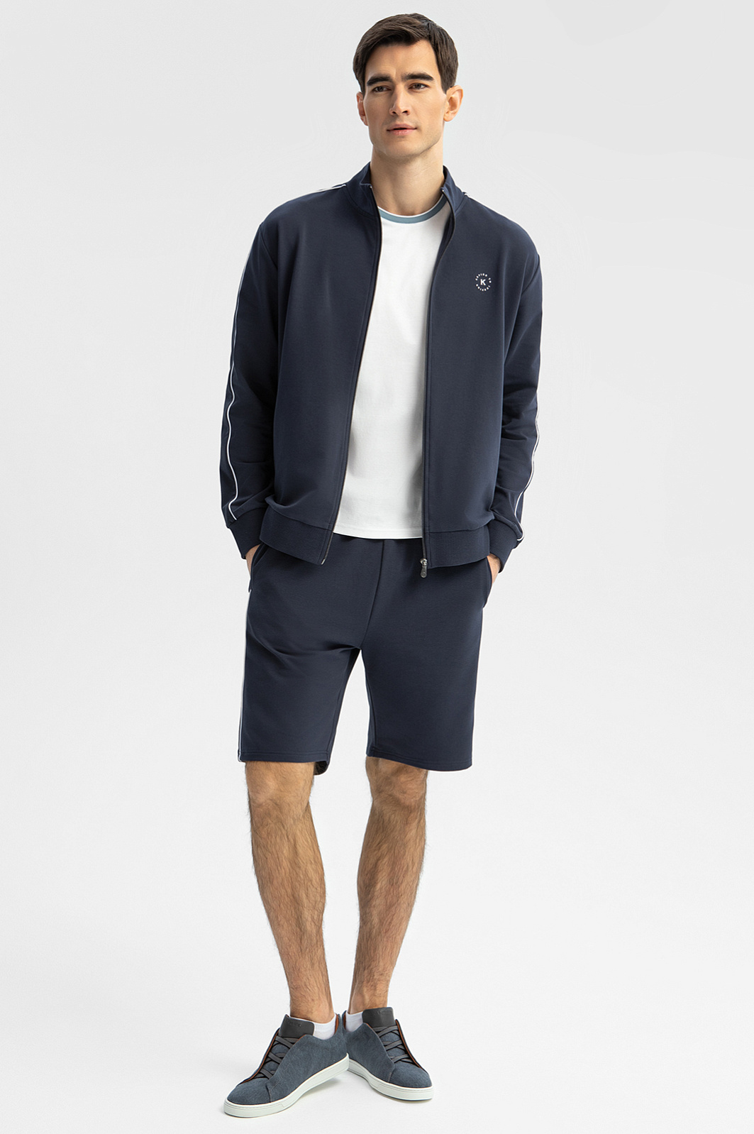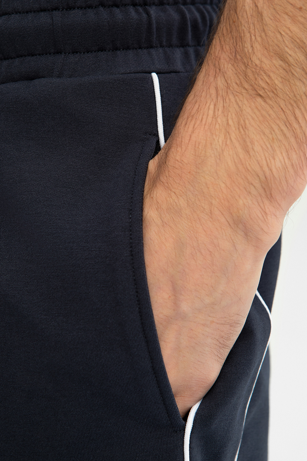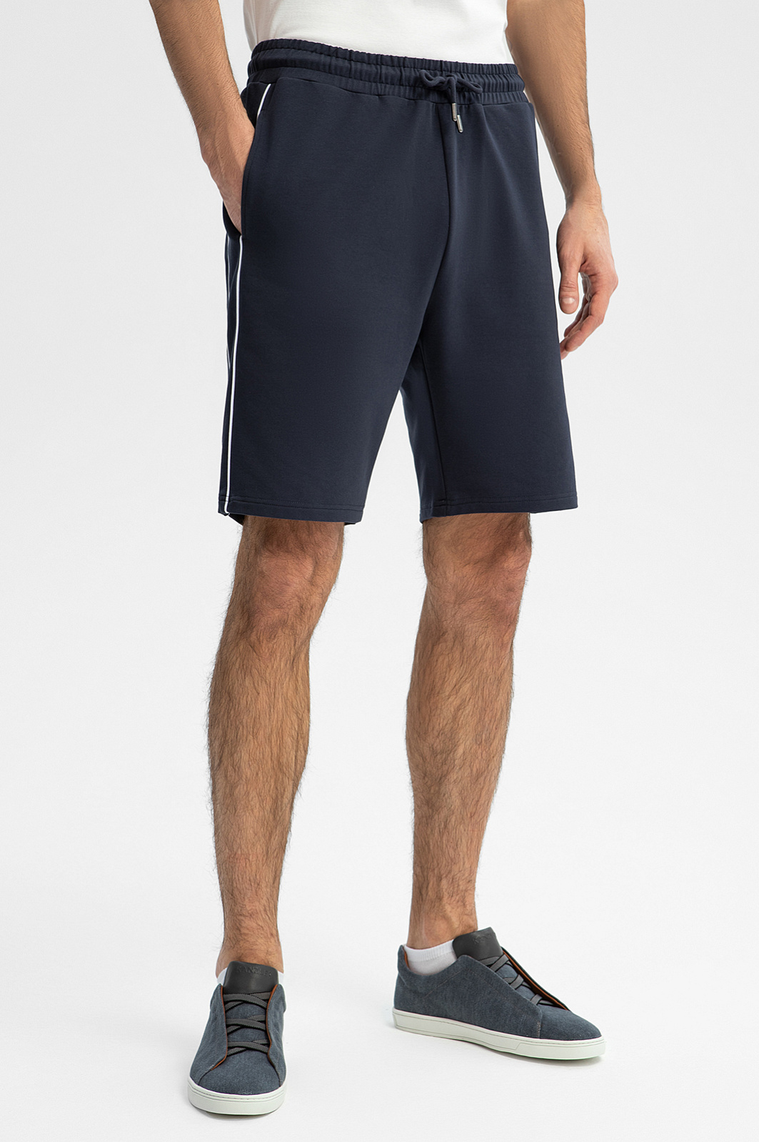 Удобные шорты KANZLER глубокого синего цвета на кулиске незаменимы для активного отдыха. Формула комфорта этой модели: свободный крой, широкая резинка, спортивная кулиска для регулирования объема талии и мягкая ткань из хлопка. Спортивный характер подчеркивают тонкие вертикальные боковые полоски и небольшой принт со слоганом. Тактильно приятный смесовой материал прослужит долго, не теряя первоначального вида. В составе: воздухопроницаемый гипоаллергенный хлопок (66%), износоустойчивый полиэстер и эластичный спандекс. Параметры модели: рост 192, 101-76-97 Размер на модели: M
