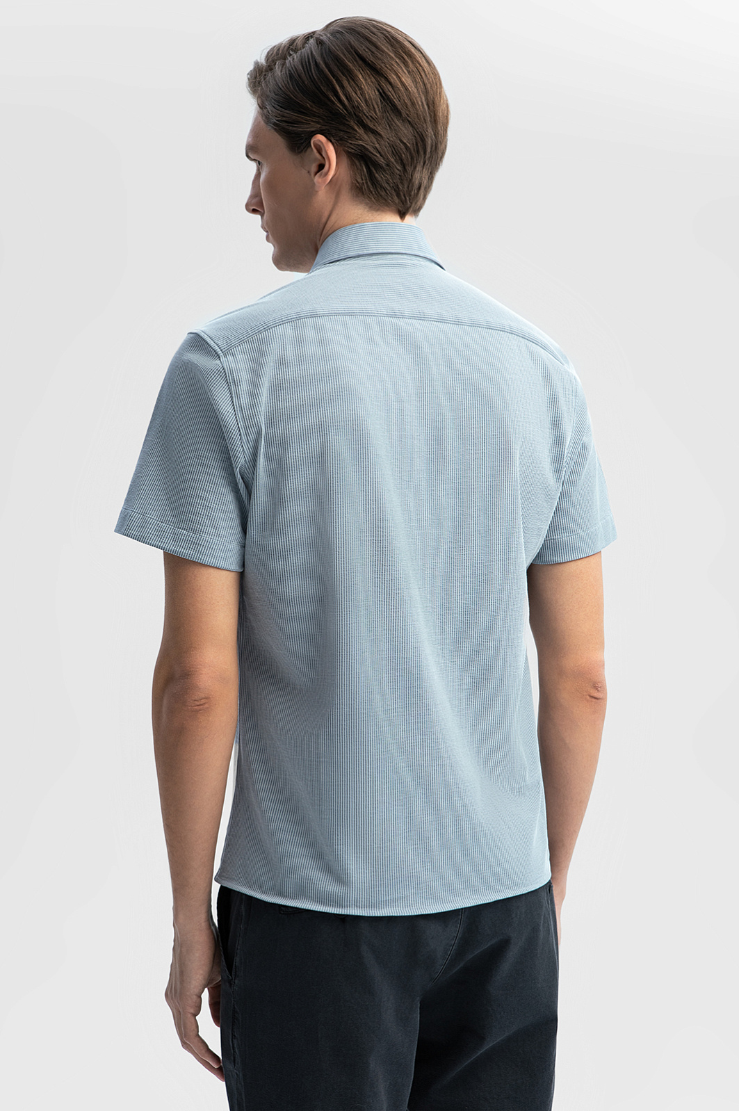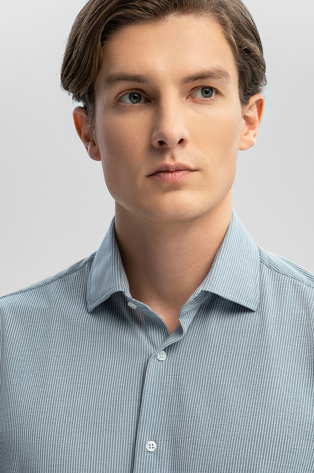 Сорочка KANZLER из трикотажной ткани в полоску создана для тех, кто ценит баланс между строгостью и комфортом. Технологичный материал идеален для активного образа жизни: натуральный хлопок обеспечивает мягкость и дышащие свойства, а полиэстер добавляет эластичность, устойчивость к сминанию и сохраняет форму после долгого дня. Тонкая вертикальная полоска визуально вытягивает силуэт, добавляя образу легкости и динамики, а приглушенный серый оттенок гармонично сочетается с любой палитрой. Приталенный крой – это точность линий и свобода движений. Силуэт деликатно подчеркивает линию плеч и талии. Сочетайте сорочку с черными брюками и кожаными лоферами для офисного стиля или дополните ее бежевыми бермудами и эспадрильями для прогулки у моря. Параметры модели: рост 191, 97-77-99 Размер на модели: 40