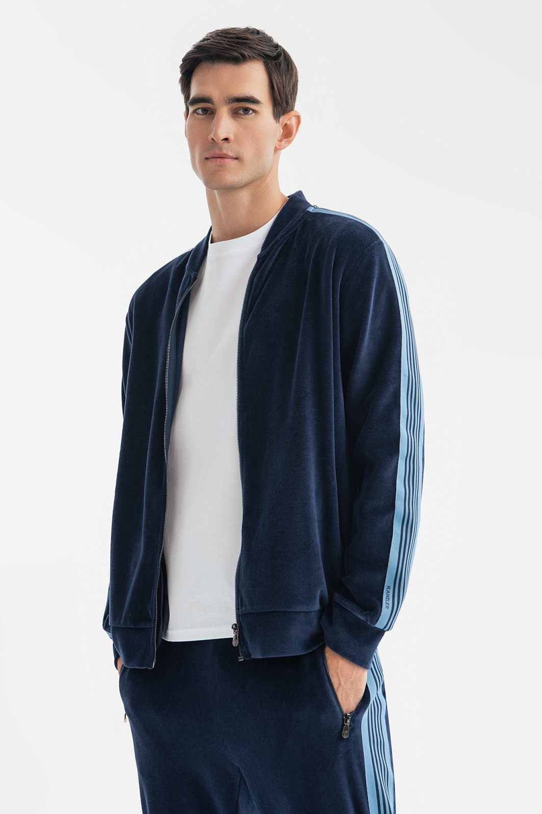 Толстовка KANZLER из хлопкового велюра на молнии предназначена для активного отдыха. Ее можно носить с джинсами и велюровыми брюками KANZLER, как спортивный костюм. Ткань мягко облегает тело, создавая красивую драпировку. Широкие полосатые лампасы и молнии добавляют спортивного шика и динамичности. Боковые карманы согреют и защитят руки от ветра. Эффектный, приятный на ощупь материал создан из натурального хлопка, который поддерживает естественное тепло тела и отводит лишнюю влагу. Суперпрочные волокна полиэстера добавлены в ткань для практичности и износоустойчивости. Параметры модели: рост 192, 101-76-97 Размер на модели: M