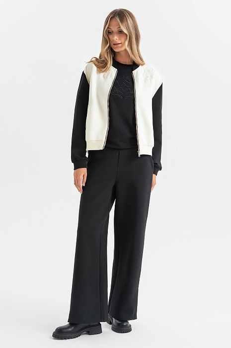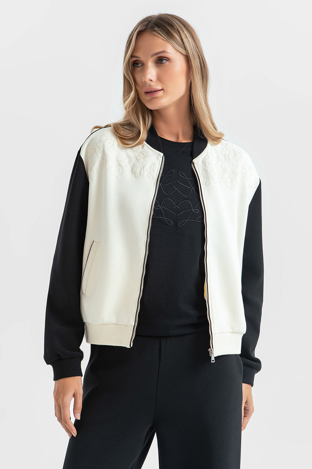 Аккуратный бомбер с застежкой на металлическую молнию в стиле кежуал — прекрасная альтернатива ветровке, жакету или легкой куртке, которая идеально дополняет как повседневный, так и спортивный образ. Контрастные черные рукава и задняя часть изделия выгодно подчеркивают мягкий белый оттенок. Изящная цветочная вышивка добавляет утонченности и женственности. Мягкий материал из натурального хлопка, прочного полиэстера и эластичного спандекса обеспечивает изделию легкость и воздухопроницаемость. Свободный крой дарит ощущение свободы, а трикотажные манжеты и надежная застежка на молнию завершают образ, делая его идеальным выбором для прохладных дней. Параметры модели: рост 180, 87-61-91 Размер на модели: S