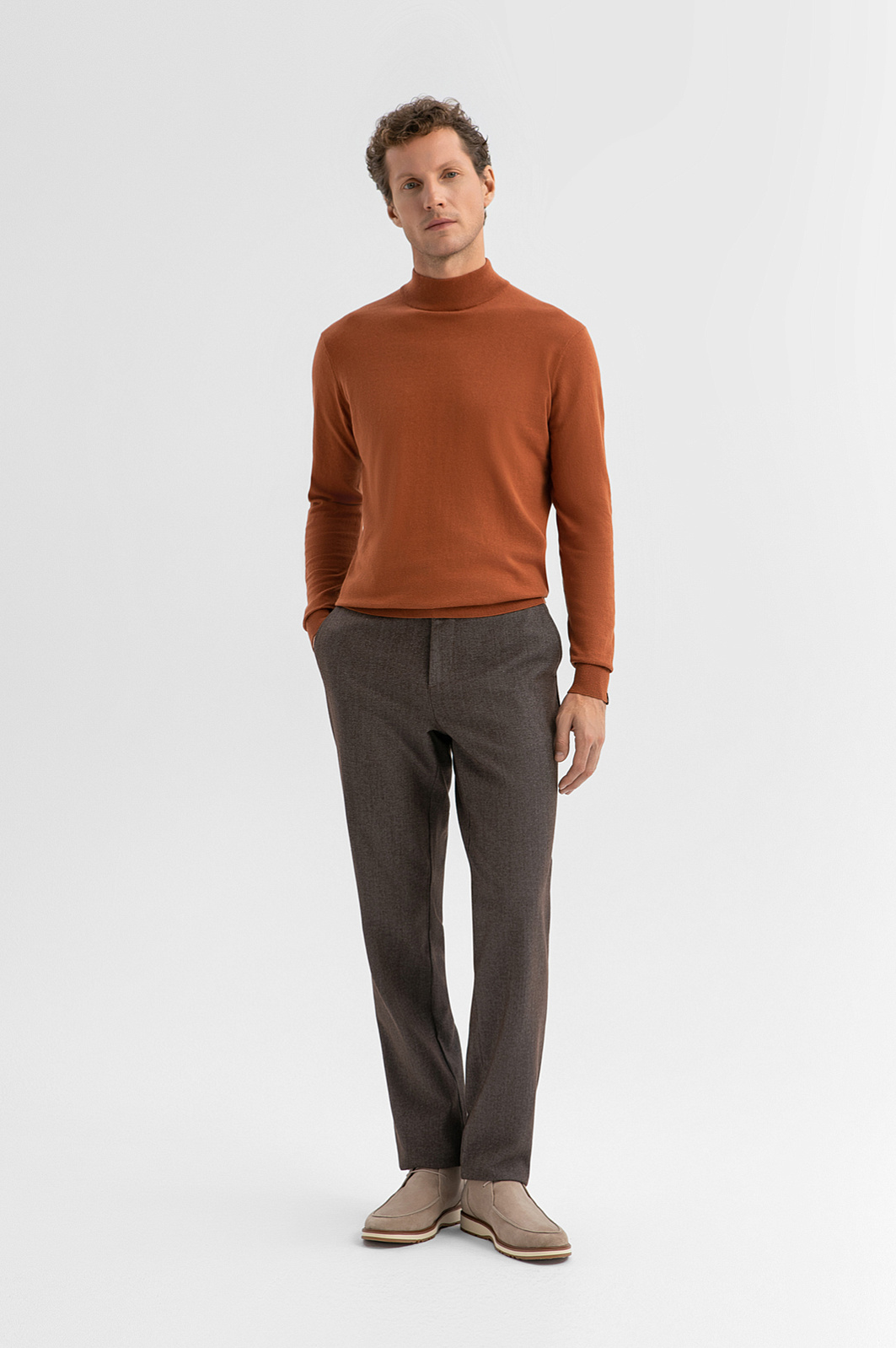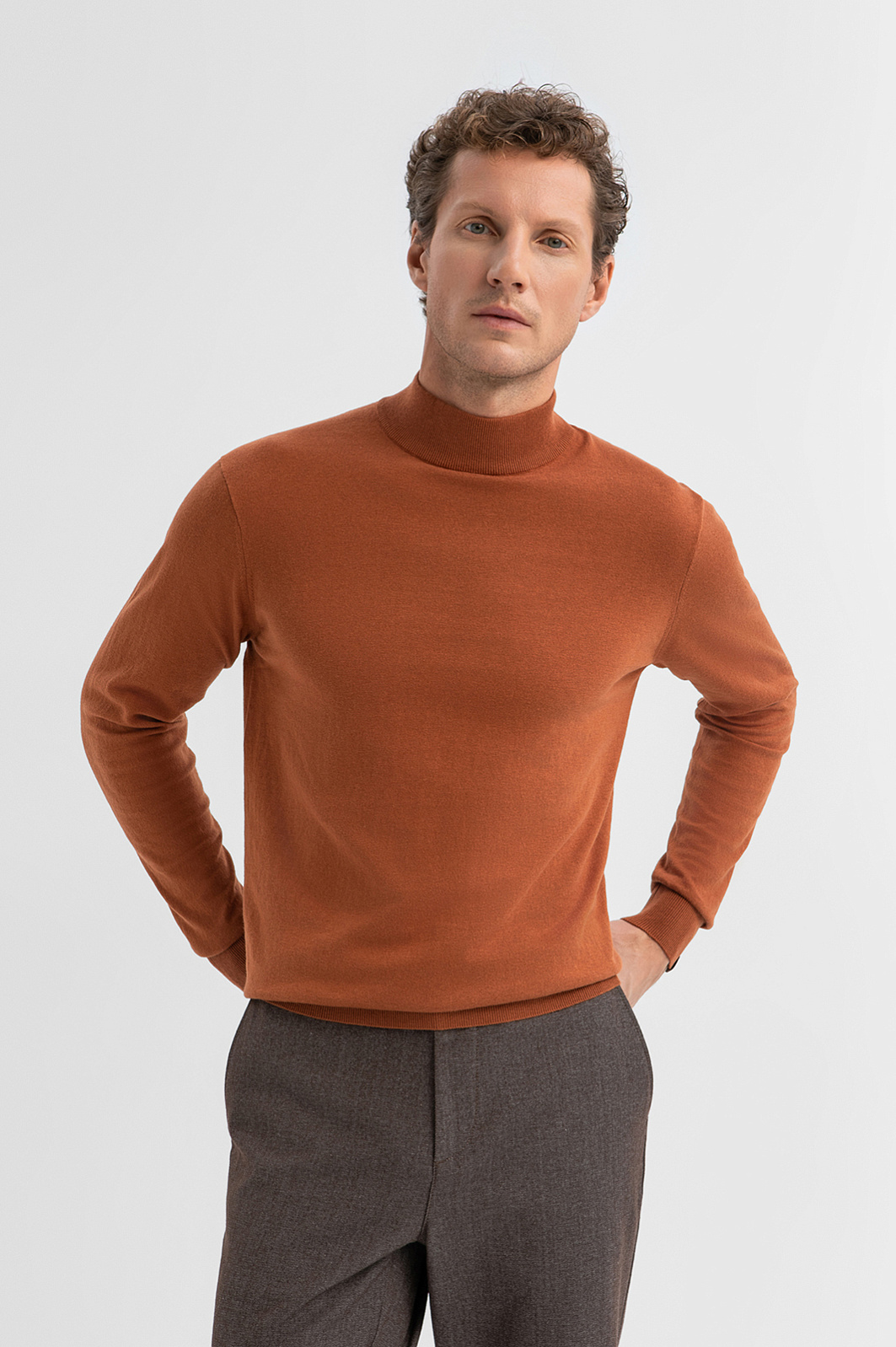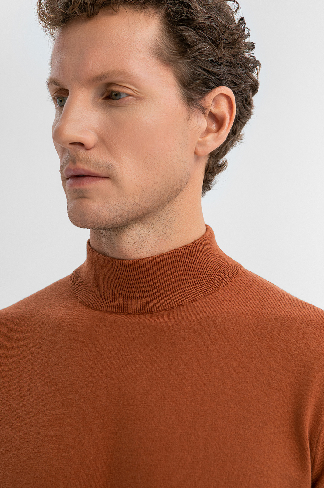 Водолазка KANZLER из хлопка и кашемира — стильная модель с характером. Приятный охристо-коричневый оттенок добавляет тепла и глубины в повседневный и офисный образы. В прохладные дни ее можно надеть под пиджак, куртку, плащ или пальто. Воротник-стойка и манжеты выполнены из эластичной трикотажной резинки — они аккуратно облегают и сохраняют форму даже при частой носке. Модель выполнена из благородного трикотажа на основе легкого гипоаллергенного хлопка (95%) с добавлением роскошного кашемира (5%). Это превосходный материал даже очень чувствительной кожи — мягкий, воздухопроницаемый, тёплый и тактильно комфортный. Параметры модели: рост 188, 97-82-92 Размер на модели: M